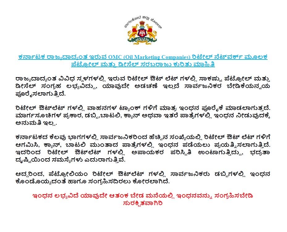 ಕರ್ನಾಟಕ ರಾಜ್ಯದಾದ್ಯಂತ ಇರುವ OMC (Oil Marketing Companies) ರಿಟೇಲ್ ನೆಟ್ವರ್ಕ್ ಮೂಲಕ ಪೆಟ್ರೋಲ್ ಮತ್ತು ಡೀಸೆಲ್ ಸರಬರಾಜು ಕುರಿತು ಮಾಹಿತಿ : @IgpBelagavi @DgpKarnataka Karnataka State Police