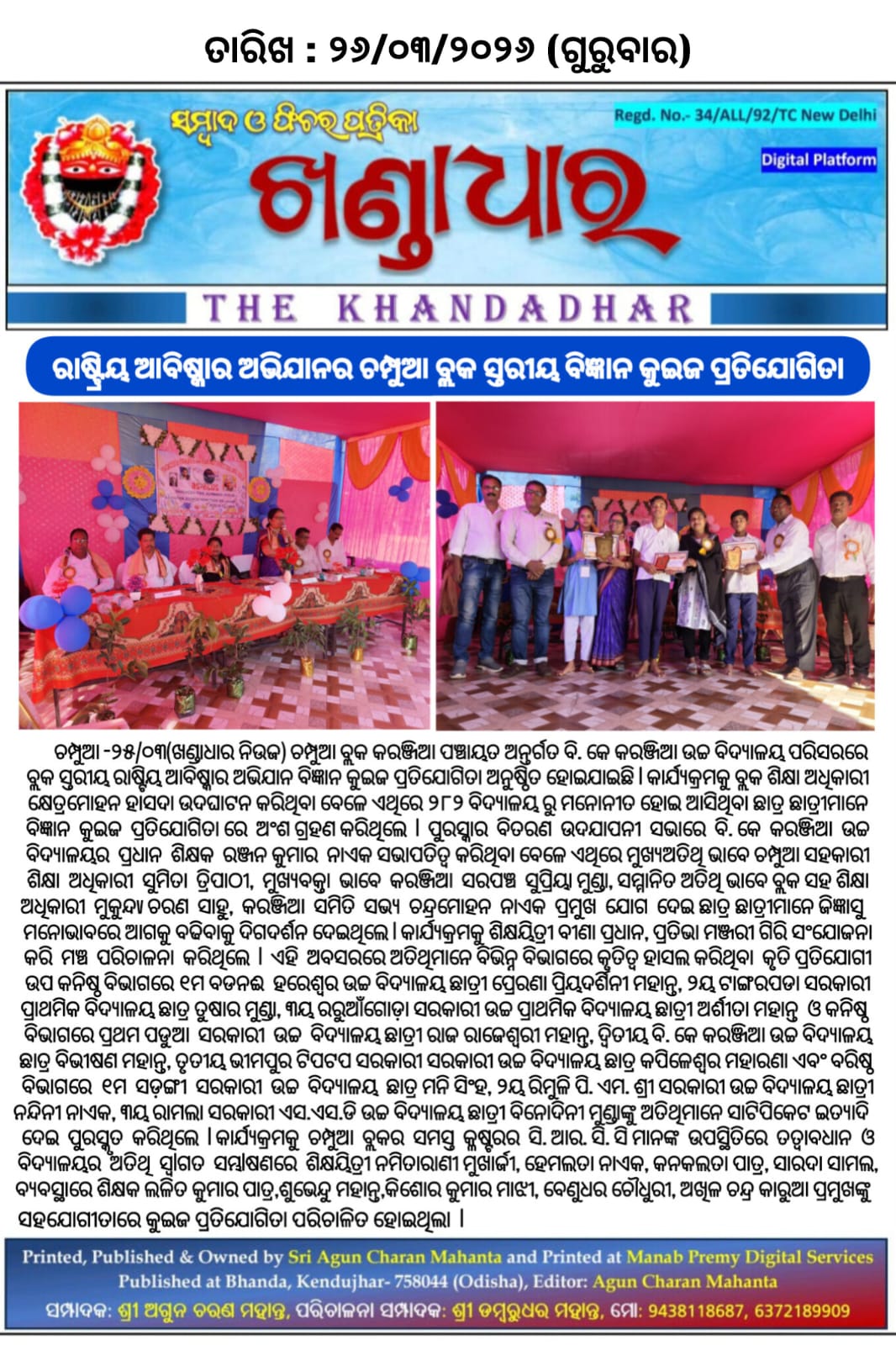 ଚମ୍ପୁଆ -୨୫/୦୩ (ଖଣ୍ଡାଧାର ନିଉଜ) ଚମ୍ପୁଆ ବ୍ଲକ କରଞ୍ଜିଆ ପଞ୍ଚାୟତ ଅନ୍ତର୍ଗତ ବି. କେ କରଞ୍ଜିଆ ଉଚ୍ଚ ବିଦ୍ୟାଳୟ ପରିସରରେ ବ୍ଲକ ସ୍ତରୀୟ ରାଷ୍ଟିୟ ଆବିଷ୍କାର ଅଭିଯାନ ବିଜ୍ଞାନ କୁଇଜ ପ୍ରତିଯୋଗିତା ଅନୁଷ୍ଠିତ ହୋଇଯାଇଛି l କାର୍ଯ୍ୟକ୍ରମକୁ ବ୍ଲକ ଶିକ୍ଷା ଅଧିକାରୀ କ୍ଷେତ୍ରମୋହନ ହାସଦା ଉଦଘାଟନ କରିଥିବା ବେଳେ ଏଥିରେ ୨୮୨ ବିଦ୍ୟାଳୟ ରୁ ମନୋନୀତ ହୋଇ ଆସିଥିବା ଛାତ୍ର ଛାତ୍ରୀମାନେ ବିଜ୍ଞାନ କୁଇଜ ପ୍ରତିଯୋଗିତା ରେ ଅଂଶ ଗ୍ରହଣ କରିଥିଲେ l ପୁରସ୍କାର ବିତରଣ ଉଦଯାପନୀ ସଭାରେ ବି. କେ କରଞ୍ଜିଆ ଉଚ୍ଚ ବିଦ୍ୟାଳୟର ପ୍ରଧାନ ଶିକ୍ଷକ ରଞ୍ଜନ କୁମାର ନାଏକ ସଭାପତିତ୍ୱ କରିଥିବା ବେଳେ ଏଥିରେ ମୁଖ୍ୟଅତିଥି ଭାବେ ଚମ୍ପୁଆ ସହକାରୀ ଶିକ୍ଷା ଅଧିକାରୀ ସୁମିତା ତ୍ରିପାଠୀ, ମୁଖ୍ୟବକ୍ତା ଭାବେ କରଞ୍ଜିଆ ସରପଞ୍ଚ ସୁପ୍ରିୟା ମୁଣ୍ଡା, ସମ୍ମାନିତ ଅତିଥି ଭାବେ ବ୍ଲକ ସହ ଶିକ୍ଷା ଅଧିକାରୀ ମୁକୁନ୍ଦ ଚରଣ ସାହୁ, କରଞ୍ଜିଆ ସମିତି ସଭ୍ୟ ଚନ୍ଦ୍ରମୋହନ ନାଏକ ପ୍ରମୁଖ ଯୋଗ ଦେଇ ଛାତ୍ର ଛାତ୍ରୀମାନେ ଜିଜ୍ଞାସୁ ମନୋଭାବ ନେଇ ଆଗକୁ ବଢିବାକୁ ଦିଗଦର୍ଶନ ଦେଇଥିଲେ l କାର୍ଯ୍ୟକ୍ରମକୁ ଶିକ୍ଷୟିତ୍ରୀ ବୀଣା ପ୍ରଧାନ, ପ୍ରତିଭା ମଞ୍ଜରୀ ଗିରି ସଂଯୋଜନା କରି ମଞ୍ଚ ପରିଚାଳନା କରିଥିଲେ l ଏହି ଅବସରରେ ଅତିଥିମାନେ ବିଭିନ୍ନ ବିଭାଗରେ କୃତିତ୍ୱ ହାସଲ କରିଥିବା କୃତି ପ୍ରତିଯୋଗୀ ଉପ କନିଷ୍ଠ ବିଭାଗରେ ୧ମ ବଡନଈ ହରେଶ୍ବର ଉଚ୍ଚ ବିଦ୍ୟାଳୟ ଛାତ୍ରୀ ପ୍ରେରଣା ପ୍ରିୟଦର୍ଶିନୀ ମହାନ୍ତ, ୨ୟ ଟାଙ୍ଗରପଡା ସରକାରୀ ପ୍ରାଥମିକ ବିଦ୍ୟାଳୟ ଛାତ୍ର ତୁଷାର ମୁଣ୍ଡା, ୩ୟ ରରୁଆଁଗୋଡ଼ା ସରକାରୀ ଉଚ୍ଚ ପ୍ରାଥମିକ ବିଦ୍ୟାଳୟ ଛାତ୍ରୀ ଅର୍ଶୀତା ମହାନ୍ତ ଓ କନିଷ୍ଠ ବିଭାଗରେ ପ୍ରଥମ ପଡୁଆ ସରକାରୀ ଉଚ୍ଚ ବିଦ୍ୟାଳୟ ଛାତ୍ରୀ ରାଜ ରାଜେଶ୍ୱରୀ ମହାନ୍ତ, ଦ୍ୱିତୀୟ ବି. କେ କରଞ୍ଜିଆ ଉଚ୍ଚ ବିଦ୍ୟାଳୟ ଛାତ୍ର ବିଭୀଷଣ ମହାନ୍ତ, ତୃତୀୟ ଭୀମପୁର ଟିପଟପ ସରକାରୀ ସରକାରୀ ଉଚ୍ଚ ବିଦ୍ୟାଳୟ ଛାତ୍ର କପିଳେଶ୍ୱର ମହାରଣା ଏବଂ ବରିଷ୍ଠ ବିଭାଗରେ ୧ମ ସଡ଼ଙ୍ଗୀ ସରକାରୀ ଉଚ୍ଚ ବିଦ୍ୟାଳୟ ଛାତ୍ର ମନି ସିଂହ, ୨ୟ ରିମୁଳି ପି. ଏମ. ଶ୍ରୀ ସରକାରୀ ଉଚ୍ଚ ବିଦ୍ୟାଳୟ ଛାତ୍ରୀ ନନ୍ଦିନୀ ନାଏକ, ୩ୟ ରାମଲା ସରକାରୀ ଏସ. ଏସ. ଡି ଉଚ୍ଚ ବିଦ୍ୟାଳୟ ଛାତ୍ରୀ ବିନୋଦିନୀ ମୁଣ୍ଡାଙ୍କୁ ଅତିଥିମାନେ ସାଟିପିକେଟ ଇତ୍ୟାଦି ଦେଇ ପୁରସ୍କୃତ କରିଥିଲେ l କାର୍ଯ୍ୟକ୍ରମକୁ ଚମ୍ପୁଆ ବ୍ଲକର ସମସ୍ତ କ୍ଳଷ୍ଟରର ସି. ଆର. ସି. ସି ମାନଙ୍କ ଉପସ୍ଥିତିରେ ତତ୍ଵାବଧାନ ଓ ବିଦ୍ୟାଳୟର ଅତିଥି ସ୍ୱlଗତ ସମ୍ଭlଷଣରେ ଶିକ୍ଷୟିତ୍ରୀ ନମିତାରାଣୀ ମୁଖାର୍ଜୀ, ହେମଲତା ନାଏକ, କନକଲତା ପାତ୍ର, ସାରଦା ସାମଲ, ବ୍ୟବସ୍ଥାରେ ଶିକ୍ଷକ ଲଳିତ କୁମାର ପାତ୍ର, ଶୁଭେନ୍ଦୁ ମହାନ୍ତ, କିଶୋର କୁମାର ମାଝୀ, ବେଣୁଧର ଚୌଧୁରୀ, ଅଖିଳ ଚନ୍ଦ୍ର କାରୁଆ ପ୍ରମୁଖଙ୍କ ସହଯୋଗୀତା ରେ କୁଇଜ ପ୍ରତିଯୋଗିତା ପରିଚାଳିତ ହୋଇଥିଲା l