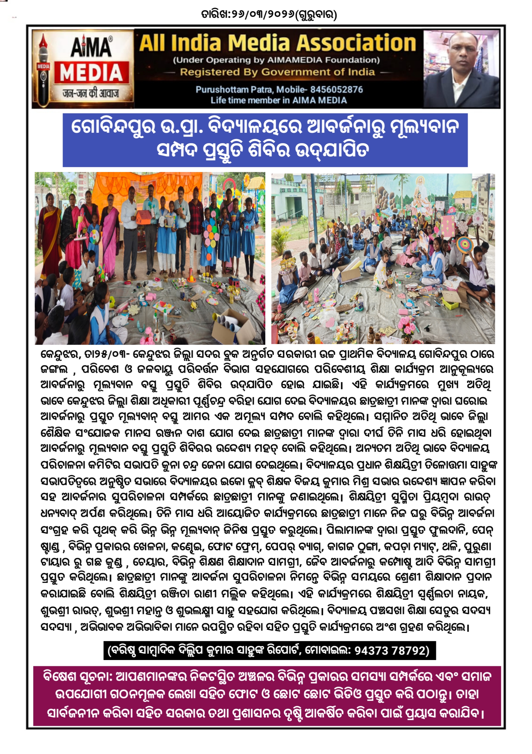 କେନ୍ଦୁଝର,ତା୨୫/୦୩- କେନ୍ଦୁଝର ଜିଲ୍ଲା ସଦର ବ୍ଲକ ଅନ୍ତର୍ଗତ ସରକାରୀ ଉଚ୍ଚ ପ୍ରାଥମିକ ବିଦ୍ୟାଳୟ ଗୋବିନ୍ଦପୁର ଠାରେ ଜଙ୍ଗଲ , ପରିବେଶ ଓ ଜଳବାୟୁ ପରିବର୍ତ୍ତନ ବିଭାଗ ସହଯୋଗରେ ପରିବେଶୀୟ ଶିକ୍ଷା କାର୍ଯ୍ୟକ୍ରମ ଆନୁକୂଲ୍ୟରେ ଆବର୍ଜନାରୁ ମୂଲ୍ୟବାନ ବସ୍ତୁ ପ୍ରସ୍ତୁତି ଶିବିର ଉଦ୍ଯାପିତ ହୋଇ ଯାଇଛି। ଏହି କାର୍ଯ୍ୟକ୍ରମରେ ମୁଖ୍ୟ ଅତିଥି ଭାବେ କେନ୍ଦୁଝର ଜିଲ୍ଲା ଶିକ୍ଷା ଅଧିକାରୀ ପୂର୍ଣ୍ଣଚନ୍ଦ୍ର ବରିହା ଯୋଗ ଦେଇ ବିଦ୍ୟାଳୟର ଛାତ୍ରଛାତ୍ରୀ ମାନଙ୍କ ଦ୍ୱାରା ଘରୋଇ ଆବର୍ଜନାରୁ ପ୍ରସ୍ତୁତ ମୂଲ୍ୟବାନ୍ ବସ୍ତୁ ଆମର ଏକ ଅମୂଲ୍ୟ ସମ୍ପଦ ବୋଲି କହିଥିଲେ । ସମ୍ମାନିତ ଅତିଥି ଭାବେ ଜିଲ୍ଲା ଶୈକ୍ଷିକ ସଂଯୋଜକ ମାନସ ରଞ୍ଜନ ଦାଶ ଯୋଗ ଦେଇ ଛାତ୍ରଛାତ୍ରୀ ମାନଙ୍କ ଦ୍ୱାରା ଦୀର୍ଘ ତିନି ମାସ ଧରି ହୋଇଥିବା ଆବର୍ଜନାରୁ ମୂଲ୍ୟବାନ ବସ୍ତୁ ପ୍ରସ୍ତୁତି ଶିବିରର ଉଦ୍ଦେଶ୍ୟ ମହତ୍ ବୋଲି କହିଥିଲେ । ଅନ୍ୟତମ ଅତିଥି ଭାବେ ବିଦ୍ୟାଳୟ ପରିଚାଳନା କମିଟିର ସଭାପତି କୁନା ଚନ୍ଦ୍ର ଜେନା ଯୋଗ ଦେଇଥିଲେ। ବିଦ୍ୟାଳୟର ପ୍ରଧାନ ଶିକ୍ଷୟିତ୍ରୀ ତିଳୋତ୍ତମା ସାହୁଙ୍କ ସଭାପତିତ୍ବରେ ଅନୁଷ୍ଠିତ ସଭାରେ ବିଦ୍ୟାଳୟର ଇକୋ କ୍ଳବ୍ ଶିକ୍ଷକ ବିଜୟ କୁମାର ମିଶ୍ର ସଭାର ଉଦ୍ଦେଶ୍ୟ ଜ୍ଞାପନ କରିବା ସହ ଆବର୍ଜନାର ସୁପରିଚାଳନା ସମ୍ପର୍କରେ ଛାତ୍ରଛାତ୍ରୀ ମାନଙ୍କୁ ଜଣାଇଥିଲେ । ଶିକ୍ଷୟିତ୍ରୀ ସୁସ୍ମିତା ପ୍ରିୟମ୍ବଦା ରାଉତ୍ ଧନ୍ୟବାଦ୍ ଅର୍ପଣ କରିଥିଲେ । ତିନି ମାସ ଧରି ଆୟୋଜିତ କାର୍ଯ୍ୟକ୍ରମରେ ଛାତ୍ରଛାତ୍ରୀ ମାନେ ନିଜ ଘରୁ ବିଭିନ୍ନ ଆବର୍ଜନା ସଂଗ୍ରହ କରି ପୃଥକ୍ କରି ଭିନ୍ନ ଭିନ୍ନ ମୂଲ୍ୟବାନ୍ ଜିନିଷ ପ୍ରସ୍ତୁତ କରୁଥିଲେ । ପିଲାମାନଙ୍କ ଦ୍ୱାରା ପ୍ରସ୍ତୁତ ଫୁଲଦାନି, ପେନ୍ ଷ୍ଟାଣ୍ଡ , ବିଭିନ୍ନ ପ୍ରକାରର ଖେଳନା , କଣ୍ଢେଇ , ଫୋଟ ଫ୍ରେମ୍ , ପେପର୍ ବ୍ୟାଗ୍ , କାଗଜ ଠୁଙ୍ଗା , କପଡ଼ା ମ୍ୟାଟ୍ , ଥଳି , ପୁରୁଣା ଟାୟାର ରୁ ଗଛ କୁଣ୍ଡ , ଚେୟାର , ବିଭିନ୍ନ ଶିକ୍ଷଣ ଶିକ୍ଷାଦାନ ସାମଗ୍ରୀ , ଜୈବ ଆବର୍ଜନାରୁ କମ୍ପୋଷ୍ଟ ଆଦି ବିଭିନ୍ନ ସାମଗ୍ରୀ ପ୍ରସ୍ତୁତ କରିଥିଲେ । ଛାତ୍ରଛାତ୍ରୀ ମାନଙ୍କୁ ଆବର୍ଜନା ସୁପରିଚାଳନା ନିମନ୍ତେ ବିଭିନ୍ନ ସମୟରେ ଶ୍ରେଣୀ ଶିକ୍ଷାଦାନ ପ୍ରଦାନ କରାଯାଇଛି ବୋଲି ଶିକ୍ଷୟିତ୍ରୀ ରଞ୍ଜିତା ରାଣୀ ମଲ୍ଲିକ କହିଥିଲେ । ଏହି କାର୍ଯ୍ୟକ୍ରମରେ ଶିକ୍ଷୟିତ୍ରୀ ସ୍ଵର୍ଣ୍ଣଲତା ନାୟକ , ଶୁଭଶ୍ରୀ ରାଉତ୍ , ଶୁଭଶ୍ରୀ ମହାନ୍ତ ଓ ଶୁଭଲକ୍ଷ୍ମୀ ସାହୁ ସହଯୋଗ କରିଥିଲେ । ବିଦ୍ୟାଳୟ ପଞ୍ଚସଖା ଶିକ୍ଷା ସେତୁର ସଦସ୍ୟ ସଦସ୍ୟା , ଅଭିଭାବକ ଅଭିଭାବିକା ମାନେ ଉପସ୍ଥିତ ରହିବା ସହିତ ପ୍ରସ୍ତୁତି କାର୍ଯ୍ୟକ୍ରମରେ ଅଂଶ ଗ୍ରହଣ କରିଥିଲେ ।
