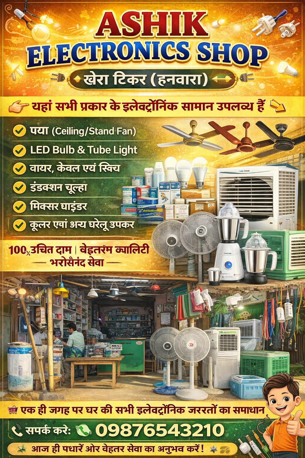 खैरा टिकर (हनवारा) क्षेत्र में स्थित ASHIK ELECTRONICS SHOP आज स्थानीय लोगों के लिए इलेक्ट्रॉनिक सामानों की एक प्रमुख और विश्वसनीय दुकान के रूप में उभरकर सामने आया है। इस दुकान में ग्राहकों की जरूरतों को ध्यान में रखते हुए पंखा, बल्ब, वायर, स्विच, बोर्ड, कूलर, मिक्सर, इंडक्शन चूल्हा सहित विभिन्न प्रकार के इलेक्ट्रॉनिक उपकरण उपलब्ध कराए जा रहे हैं।
