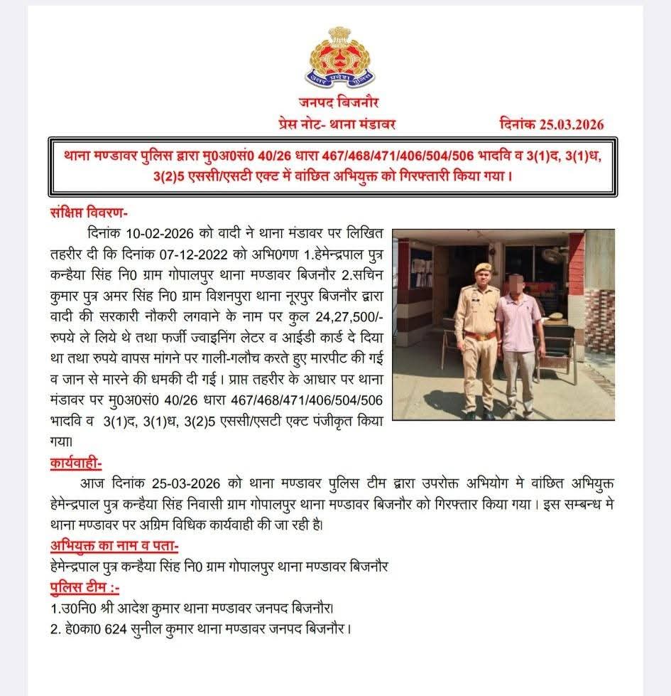 मंडावर थाना पुलिस ने सराहनीय कार्य करते हुए सरकारी नौकरी दिलाने के नाम पर लाखों रुपये की ठगी करने वाले शातिर आरोपी को गिरफ्तार किया है। यह कार्रवाई थाना प्रभारी (SHO) के कुशल नेतृत्व में की गई, जिसकी क्षेत्र में सराहना हो रही है।