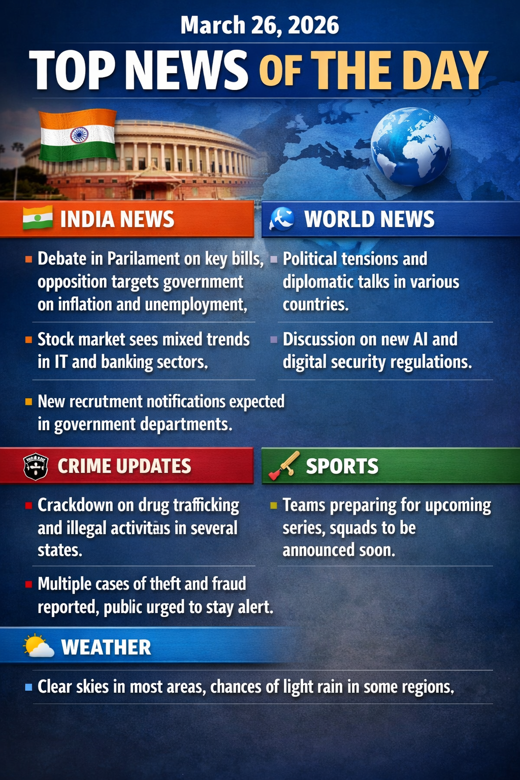 ਅੱਜ 26 ਮਾਰਚ 2026 ਦੀਆਂ ਮੁੱਖ ਤਾਜ਼ਾ ਖਬਰਾਂ (ਭਾਰਤ ਅਤੇ ਵਿਸ਼ਵ ਤੋਂ): --- 🇮🇳 ਭਾਰਤ ਦੀਆਂ ਖਬਰਾਂ