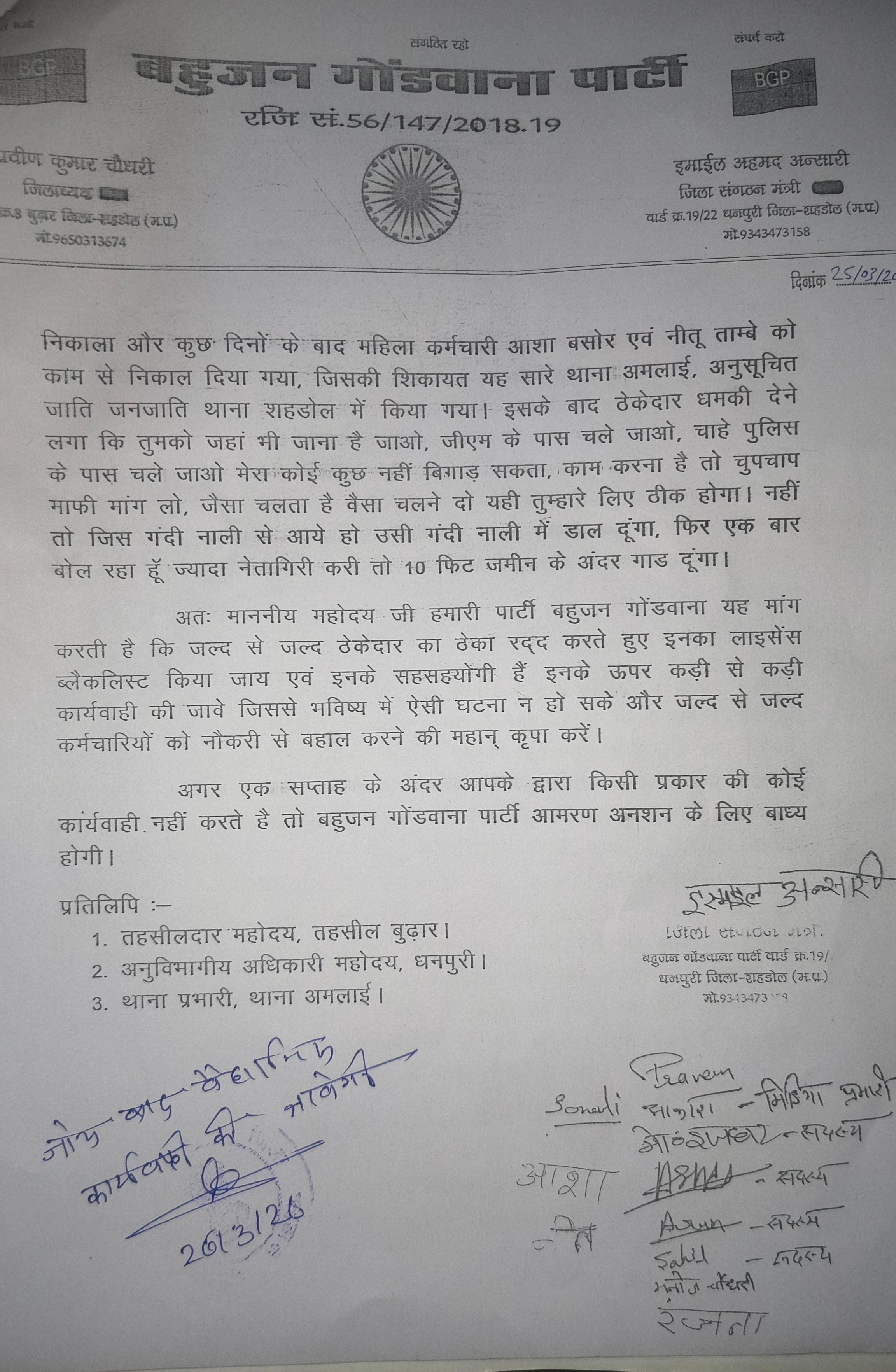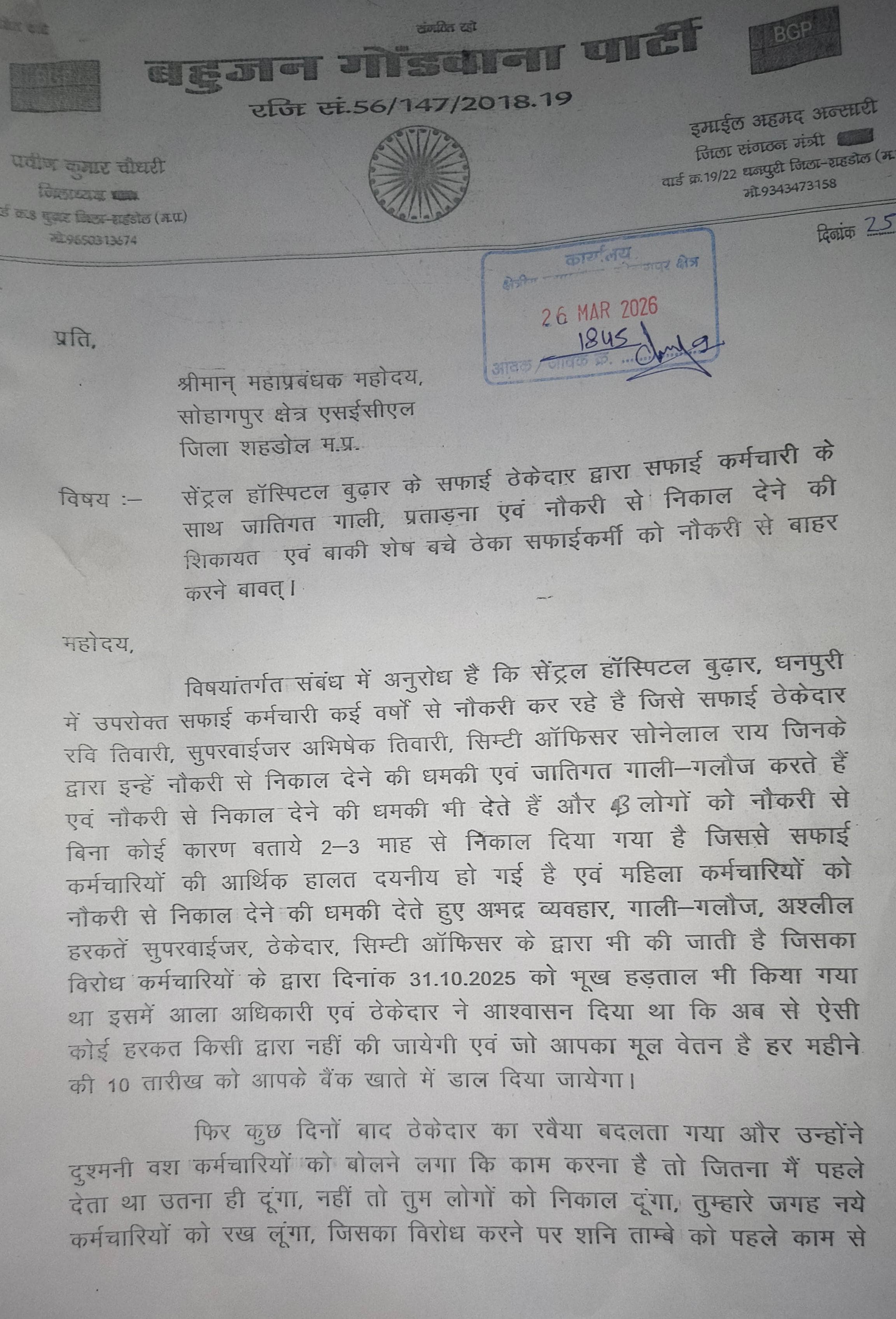 दिनांक 25/3/2026 को बहुजन गोंडवाना पार्टी के जिलाध्यक्ष शहडोल प्रवीण चौधरी एवं संगठन मंत्री इस्माइल अंसारी और पार्टी के पदाधिकारी कार्यकर्ताओ ने जीएम ऑफिस जाकर सोहागपुर महाप्रबंधक जी को ज्ञापन सौंप कर सफाई कर्मचारियों के साथ जातिगत गाली गलौज काम से निकाल देने की धमकी देने वाले ठेकेदार रवि तिवारी सुपरवाइजर अभिषेक तिवारी सेनेटरी ऑफिसर सोने लाल राय के खिलाफ कड़ी से कड़ी कार्यवाही करने की मांग रखी है और कर्मचारीयो का मूल्य वेतन भी पूरा नहीं दिया जाता है ठेकेदार द्वारा उनका अधिकार खाया जाता है अगर कर्मचारीयो को न्याय नहीं मिलता तो एक सप्ताह के बाद बहुजन गोंडवाना पार्टी आमरण अनशन भी करेगी। मौजूदा पदाधिकारी एवम कार्यकर्ता मीडिया प्रभारी शहडोल आकाश,विधानसभा प्रभारी आदित्य कुमार, महिला मोर्चा अध्यक्ष आशा वंशकार, सदस्य नीतू तांबे, सुनील सिंह, अश्विनी कुमार बहुजन गोंडवाना के सभी पदाधिकारी एवं कार्यकर्ता मौजूद थे