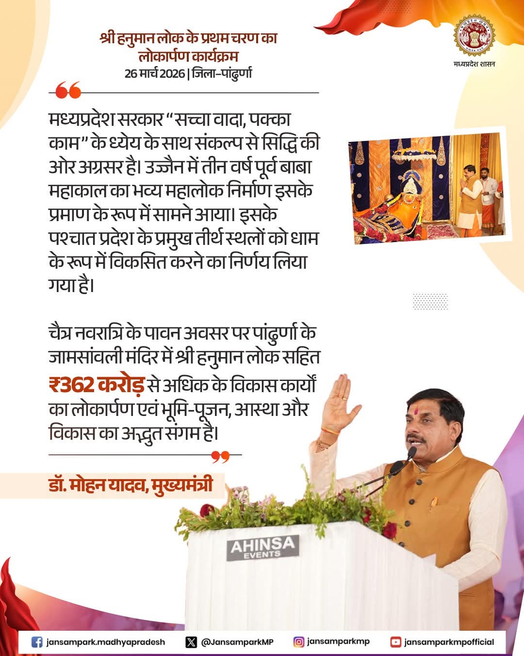 चैत्र नवरात्रि के पावन अवसर पर पांढुर्णा के जामसांवली मंदिर में श्री हनुमान लोक के लोकार्पण सहित ₹362 करोड़ से अधिक के विकास कार्यों की सौगात, आस्था और विकास का अद्भुत संगम है।