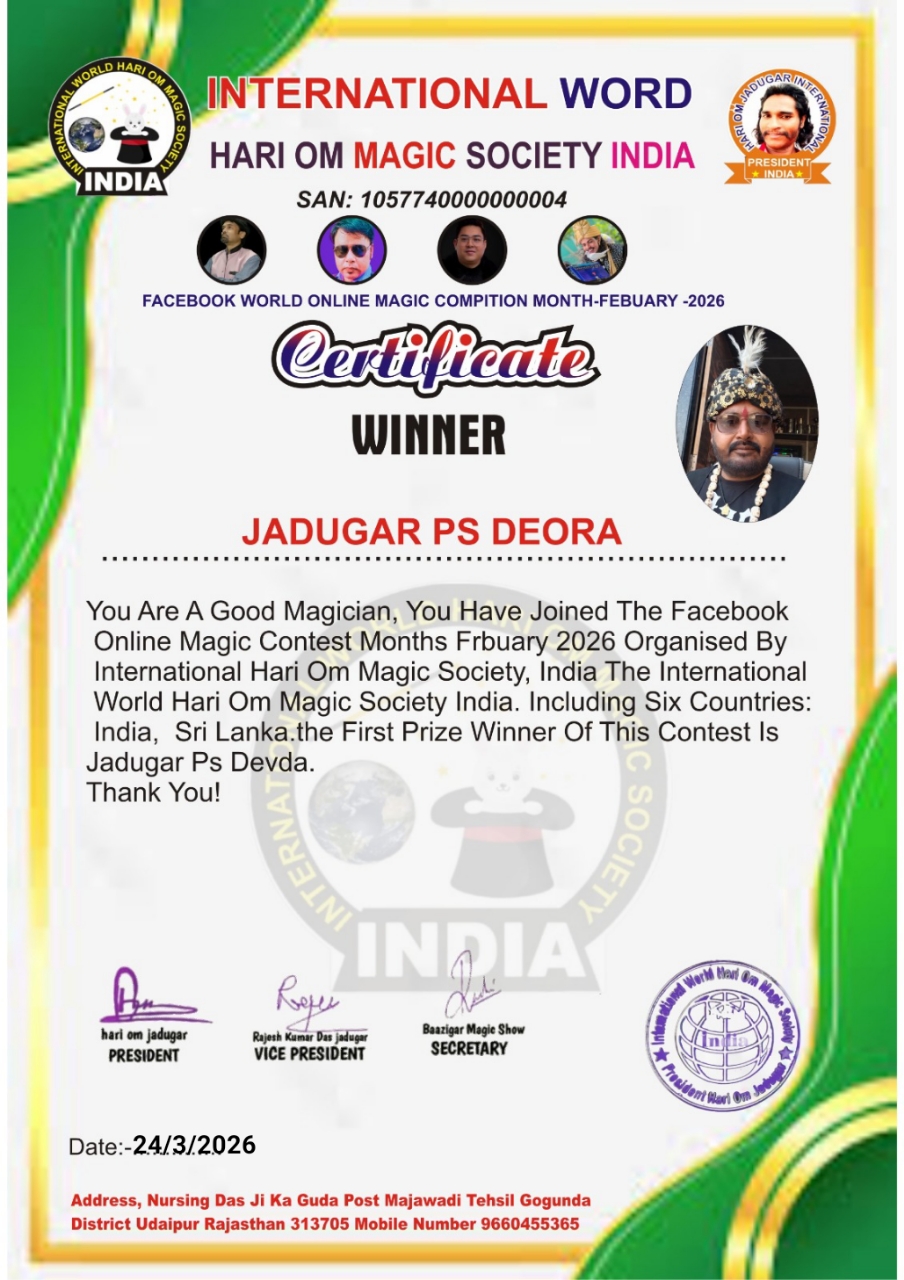 इस शानदार प्रदर्शन के लिए जादूगर पी.एस. देवड़ा को प्रथम स्थान (फर्स्ट विनर) घोषित किया गया। उन्हें मोमेंटो और सम्मान पत्र प्रदान कर सम्मानित किया गया। कार्यक्रम में राजस्थान पुलिस के सहयोग से प्रमाण पत्र भी वितरित किए गए, जिससे आयोजन की गरिमा और विश्वसनीयता और बढ़ गई।