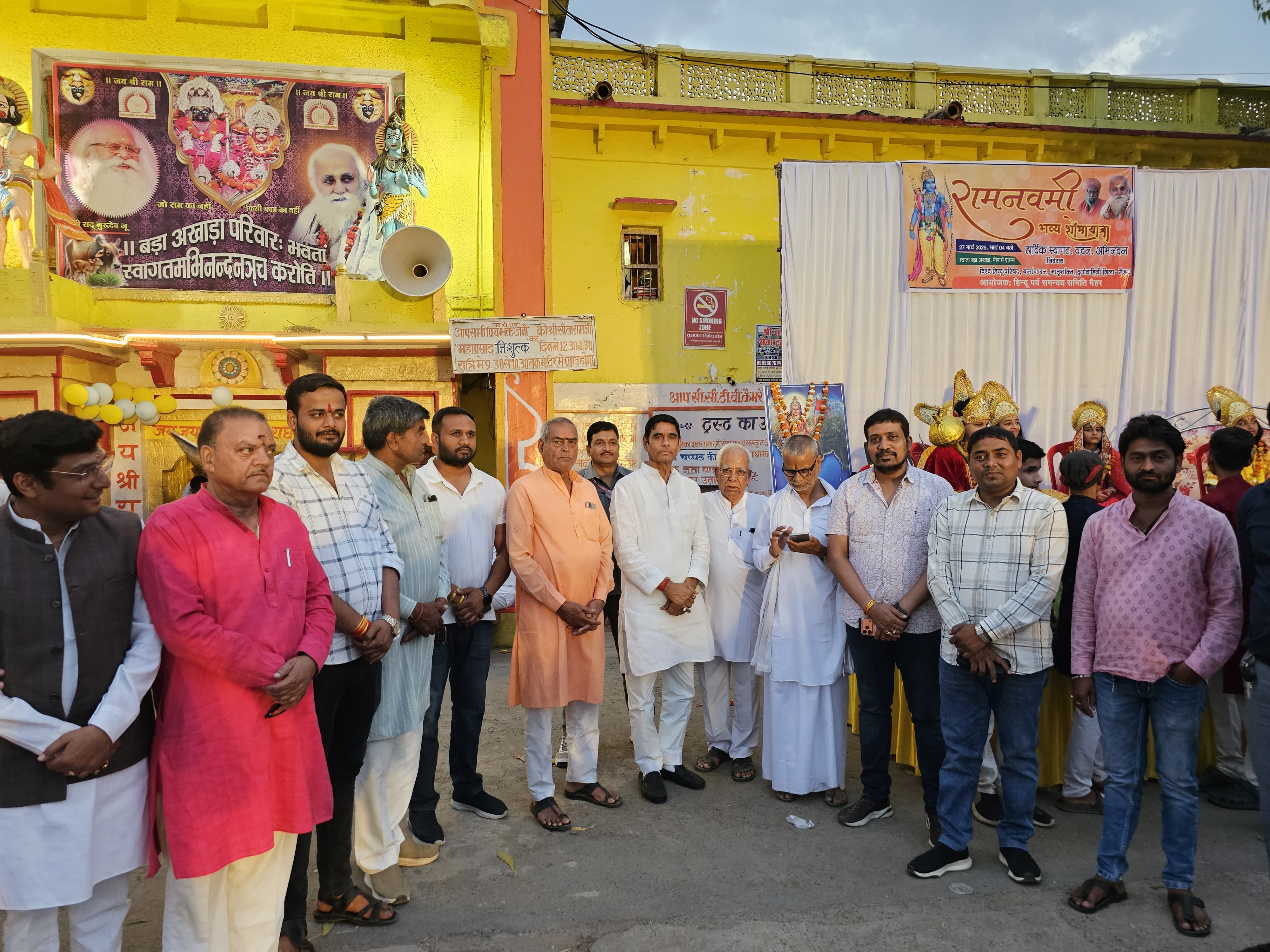 चैत्र नवरात्र के पावन अवसर पर रामनवमी के शुभ दिन मैहर नगर में भव्य और आकर्षक शोभायात्रा का आयोजन बड़े ही श्रद्धा और उल्लास के साथ किया गया। यह शोभायात्रा विश्व हिंदू परिषद, बजरंग दल एवं सर्व हिंदू समाज के तत्वावधान में श्री राम जानकी बड़ा अखाड़ा मैहर से प्रारंभ हुई। कार्यक्रम की शुरुआत बड़े अखाड़ा के महंत श्री श्री 1008 श्री सीता वल्लभ शरण जू महाराज द्वारा भगवान श्रीराम की प्रतिमा, झांकियों एवं उपस्थित गुरुजनों पर पुष्प अर्पित कर विधिवत पूजा-अर्चना के साथ की गई। इसके पश्चात शोभायात्रा नगर भ्रमण के लिए रवाना हुई।