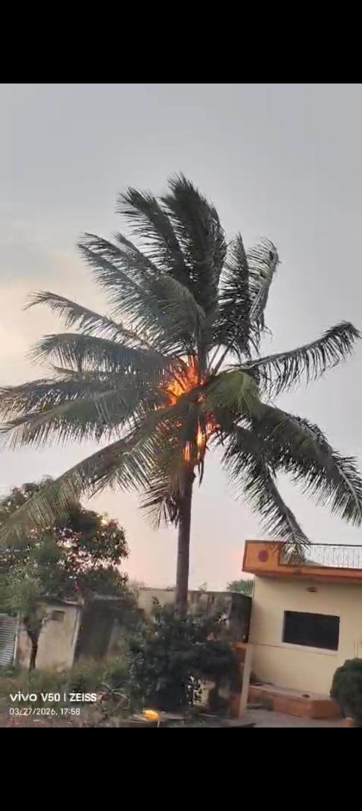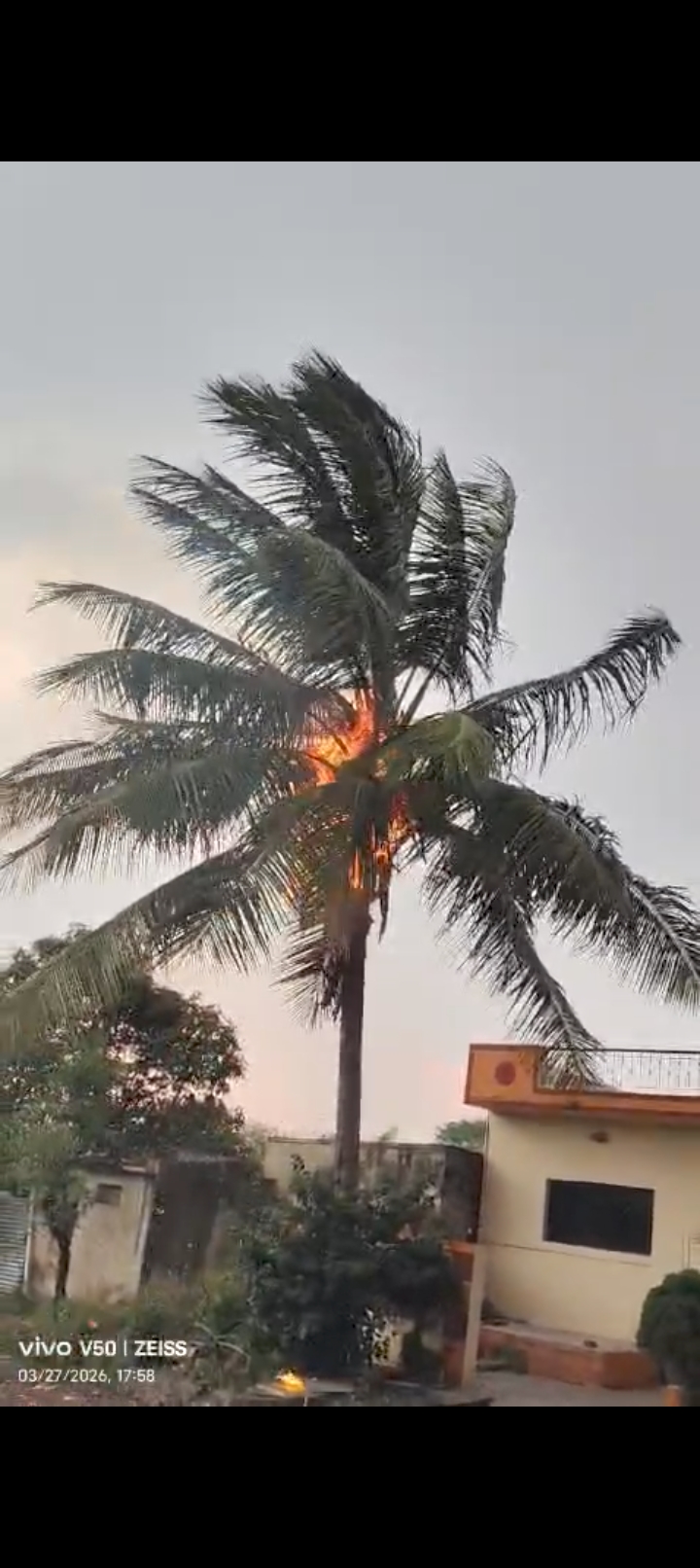 अवकाळीच्या विजेने नारळाच्या झाडाने घेतला पेट..
