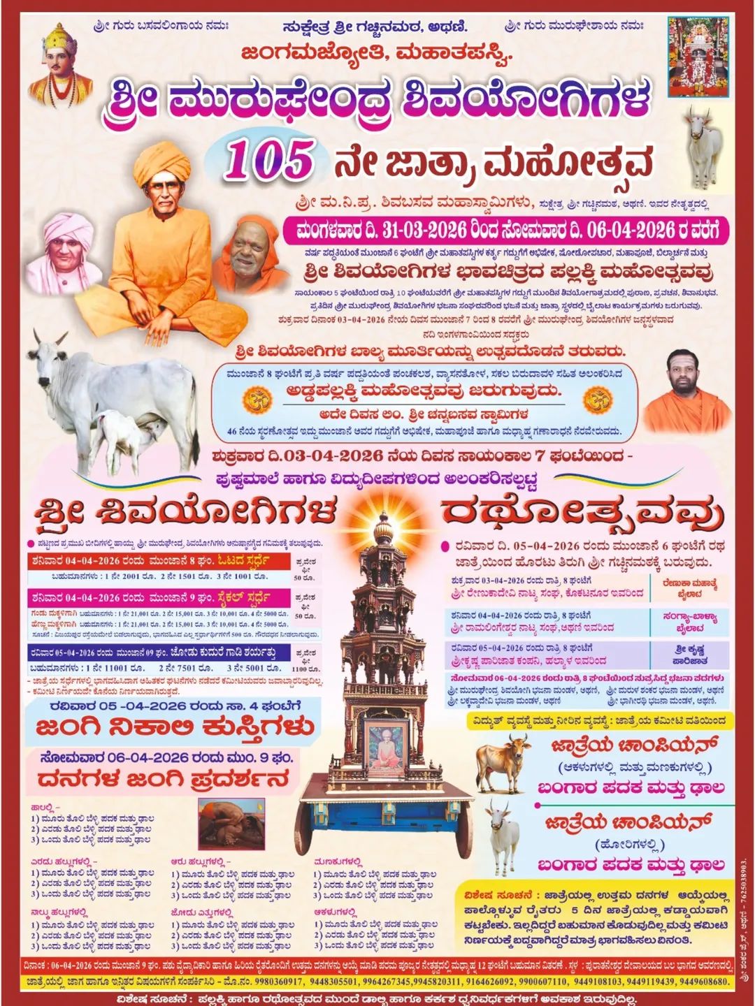 ವಿಶೇಷ ಸೂಚನೆ: ಜಾತ್ರೆಯಲ್ಲಿ ಉತ್ತಮ ದನಗಳ ಆಯ್ಕೆಯಲ್ಲಿ ಪಾಲ್ಗೊಳ್ಳುವ ರೈತರು 5 ದಿನ ಜಾತ್ರೆಯಲ್ಲಿ ಕಡ್ಡಾಯವಾಗಿ ಕಟ್ಟಬೇಕು, ಕಾಲ್ಲದಿದ್ದರೆ ಬಹುಮಾನ ಕೊಡುವದಿಲ್ಲ ಮತ್ತು ಕಮೀಟಿ ನಿರ್ಣಯಕ್ಕೆ ಬದ್ದವಾಗಿದ್ದರೆ ಮಾತ್ರ ಭಾಗವಹಿಸಲು ವಿನಂತಿ.