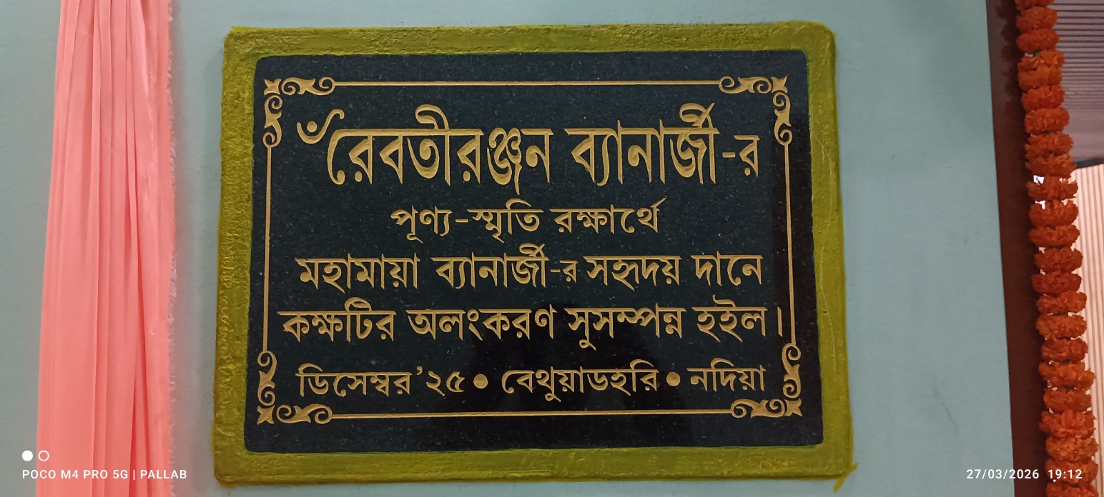 মহামায়া ব্যানার্জী-র সহৃদয় দান বেথুয়াডহরী দেশবন্ধু স্মৃতি পাঠাগারের পরিচালন সমিতির কক্ষটির অলংকরণ সুসম্পন্ন হবার পর শুভ উদ্বোধন হল। ফিতে কেটে শুভ উদ্বোধন করেন তার সড়ধর্মিনী মহামায়া ব্যানার্জী। ঐ সময় উপস্থিত ছিলেন তার এক মাত্র কন্যা সহ জামাতা, নাতনী ও পরিবারের নিকট আত্মীয়বর্গ। পাঠাগারের পক্ষ থেকে উপস্থিত ছিলেন পাঠাগার সভাপতি সুধীর বিশ্বাস, পাঠাগার সাধারণ সম্পাদক সিদ্ধার্থ দে সহ পরিচালন। সমিতির সদস্য সদস্যা সহ সাধারণ সদস্য সদস্যা গন। প্রসঙ্গত বলা যায় রেবতীরঞ্জন ব্যানার্জি সাম্প্রতিক অতীতে তিনি ১২ বছর লাইব্রেরী তথা দেশবন্ধু স্মৃতি পাঠাগারের সাধারণ সম্পাদকের দায়িত্ব পালন করেন। । পেশায় ছিলেন প্রাথমিক বিদ্যালশিক্ষকয়ের । ২৭ শে মার্চ ২০২৫ তিনি ইহলোক ত্যাগ করেন। তার প্রথম বর্ষ প্রয়ান দিবসে তার প্রতিকৃতিতে মাল্যদান ও পুষ্প প্রদানে শ্রদ্ধাঞ্জলী নিবেদনের মাধ্যমে পরিবার সহ উপস্থিত জনেরা শ্রদ্ধার্ঘ জানান।২৩ তম বৈমেলার অষ্টম দিনে প্রাতিষ্ঠানিক দিবসে শুভ উদ্বোধন অনুষ্ঠান হয়।