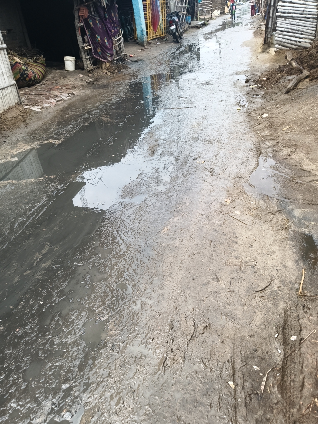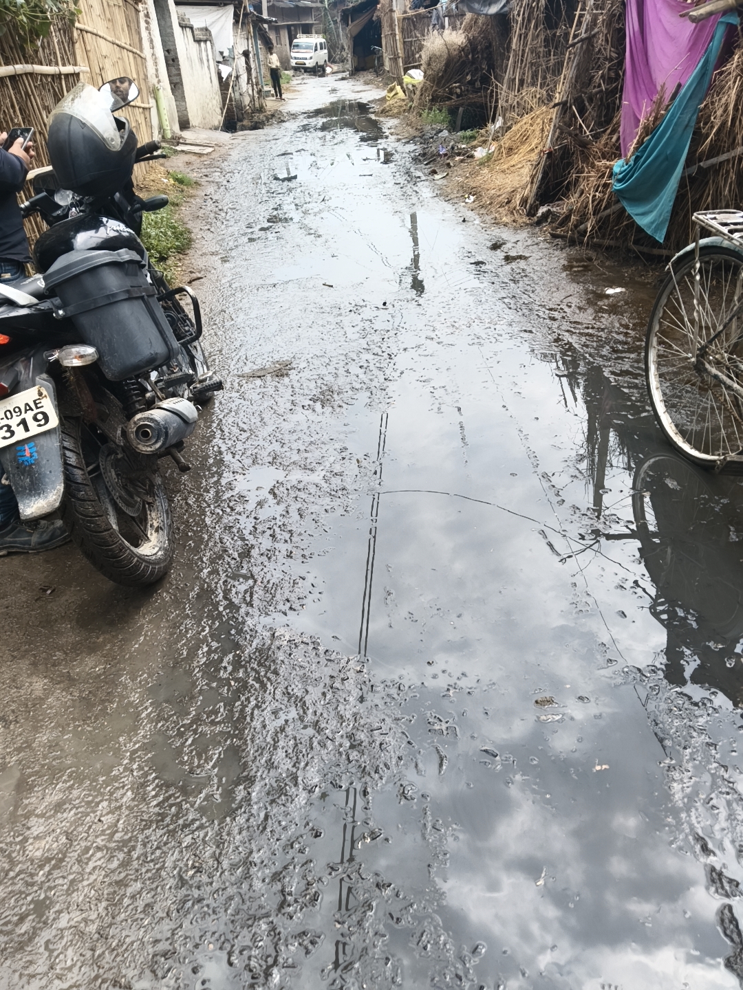 Tumhare photos dekhkar clear lag raha hai ki gali mein paani jama hai aur proper drainage (nala) nahi hai — is wajah se sadak kichad aur gandagi se bhari hui hai. Yeh sirf inconvenience nahi, balki health risk bhi hai (machhar, infection, etc.).