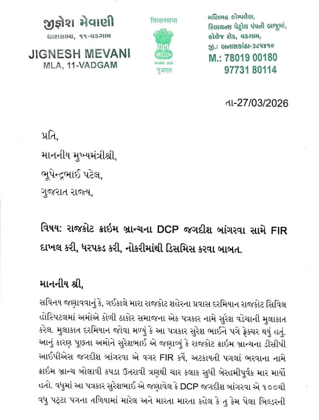 જિગ્નેશ મેવાણીએ મુખ્યમંત્રીને 27 માર્ચ 2026ના રોજ પત્ર લખી DCP જગદીશ બાંગરવા સામે FIR દાખલ કરી, ધરપકડ કરી, નોકરીમાંથી ડિસમિસ કરવાની માંગણી કરી છે.