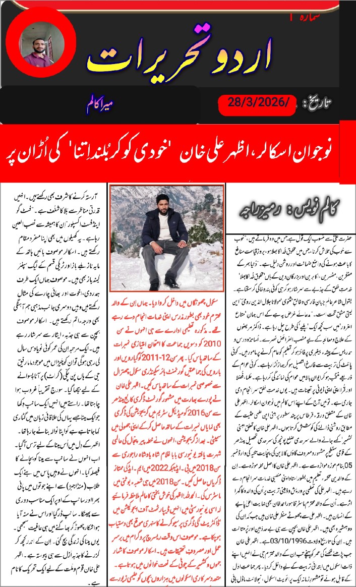 نوجوان اسکالر،اظہر علی خان 'خودی کو کر بُلند اتنا ' کی اُڑان پر