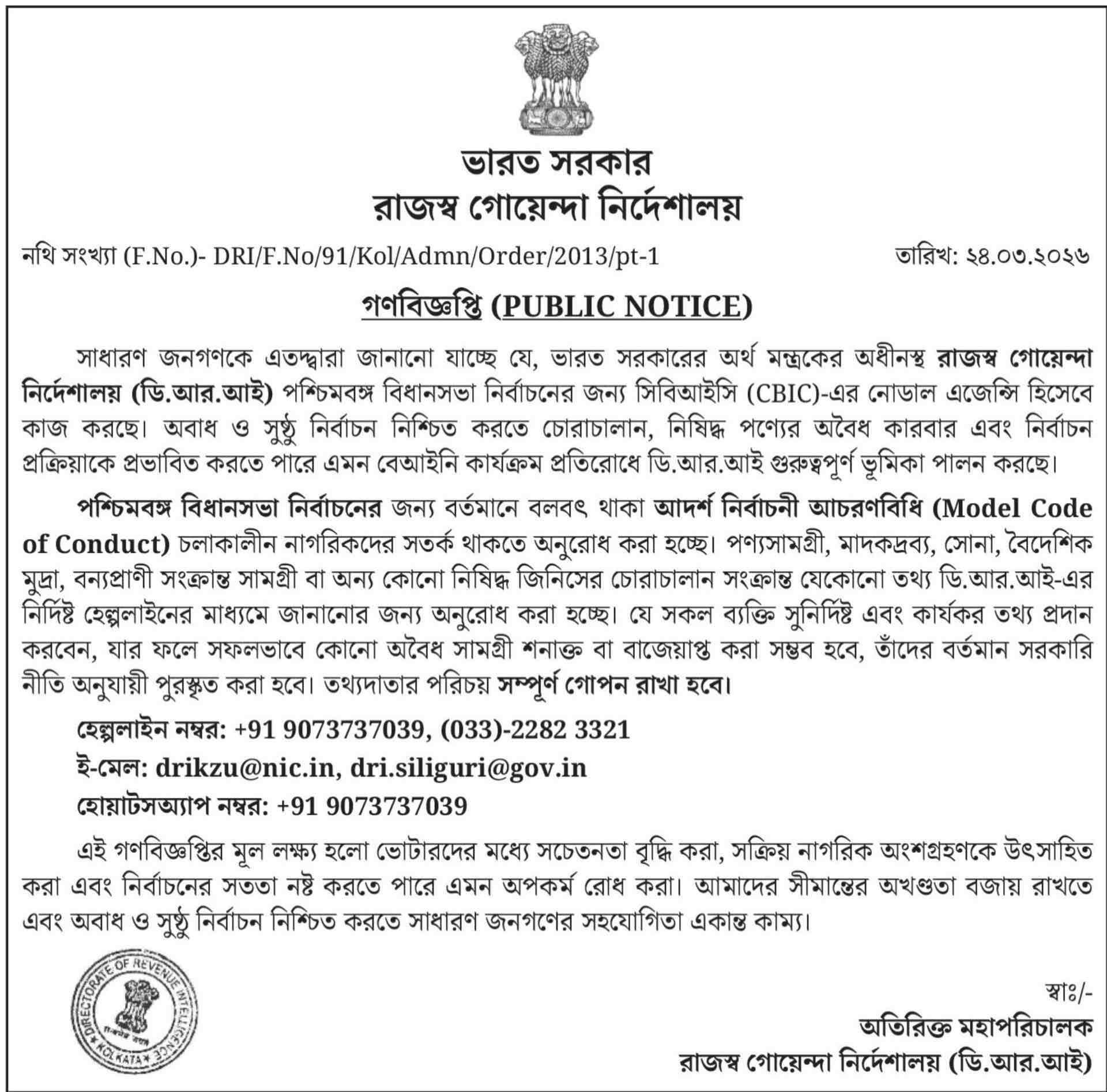 West Bengal elections ke liye DRI ko nodal agency banaya gaya hai 🇮🇳