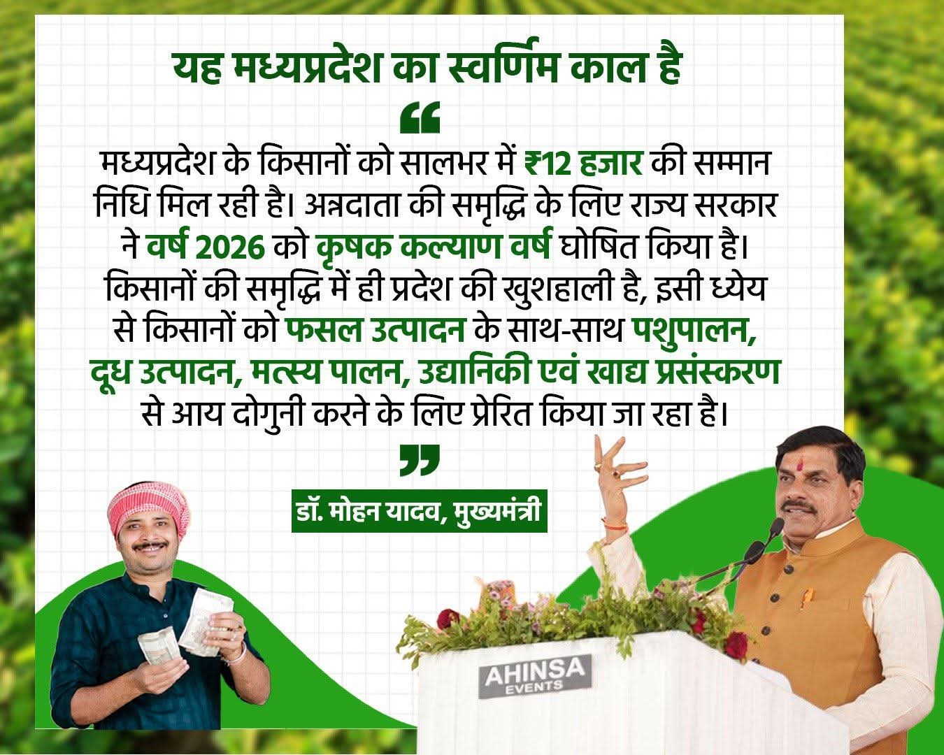 #मध्यप्रदेश के किसानों को सालभर में ₹12 हजार की सम्मान निधि मिल रही है। अन्नदाता की समृद्धि के लिए राज्य सरकार ने वर्ष 2026 को कृषक कल्याण वर्ष घोषित किया है।