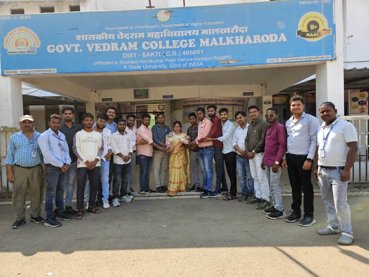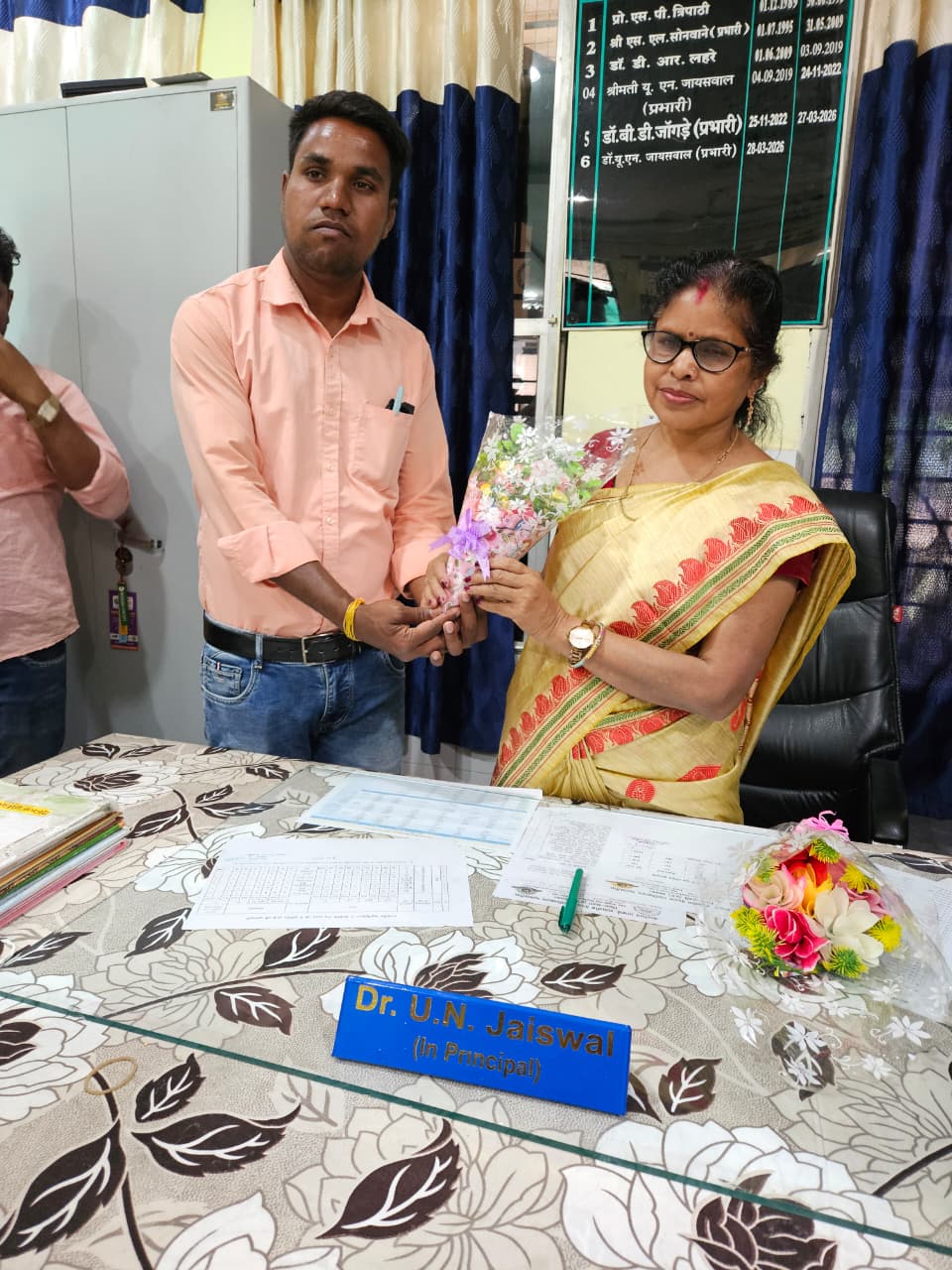 शासकीय वेदराम महाविद्यालय मालखरौदा नवीन प्रभारी प्राचार्य डॉ उमा नंदनी जयसवाल जी का स्वागत पुष्प गुच्छ देकर स्वागत किया गया।