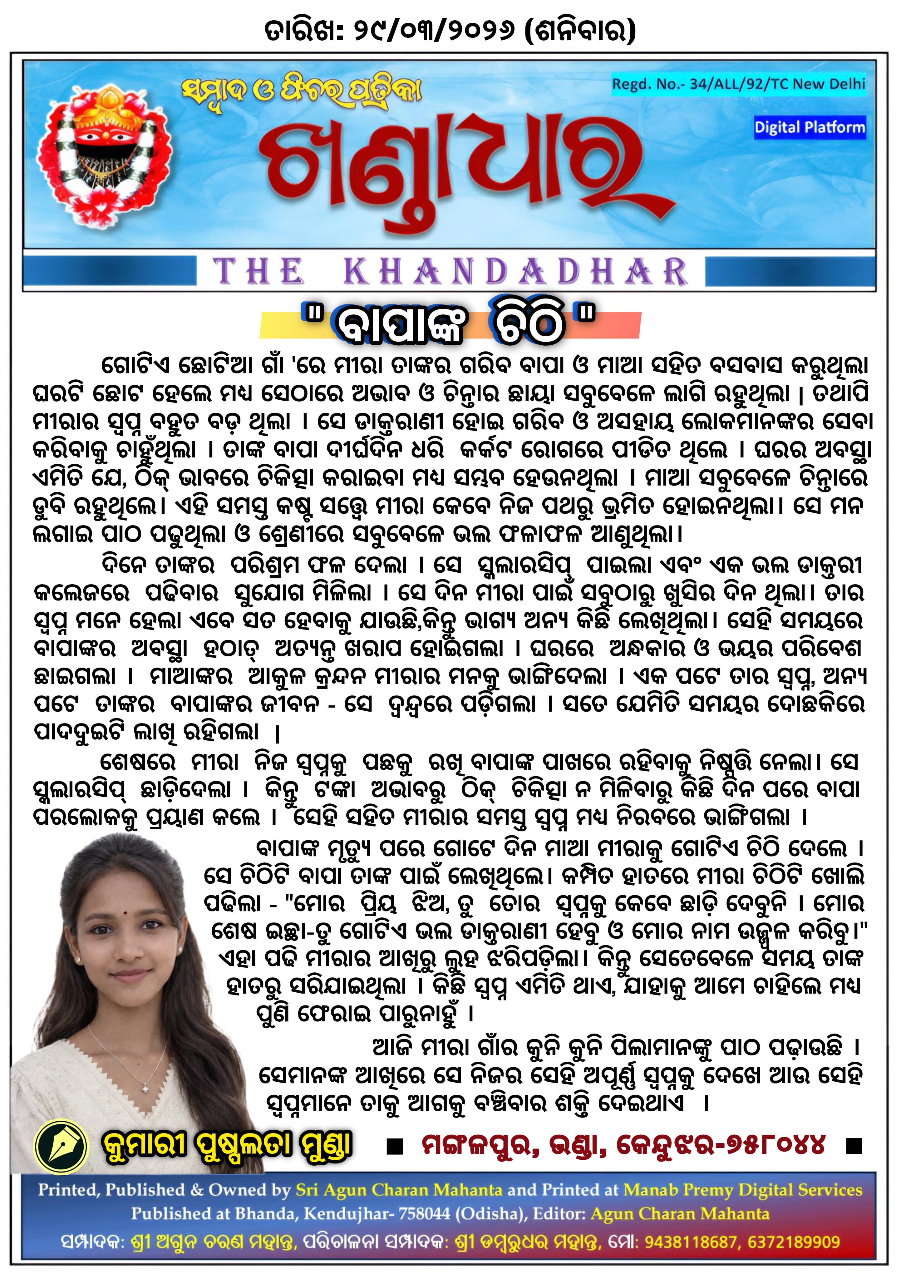 ବାପାଙ୍କ ଚିଠ ରଚନା - ସୁଶ୍ରୀ ପୁଷ୍ପଲତା ମୁଣ୍ଡା