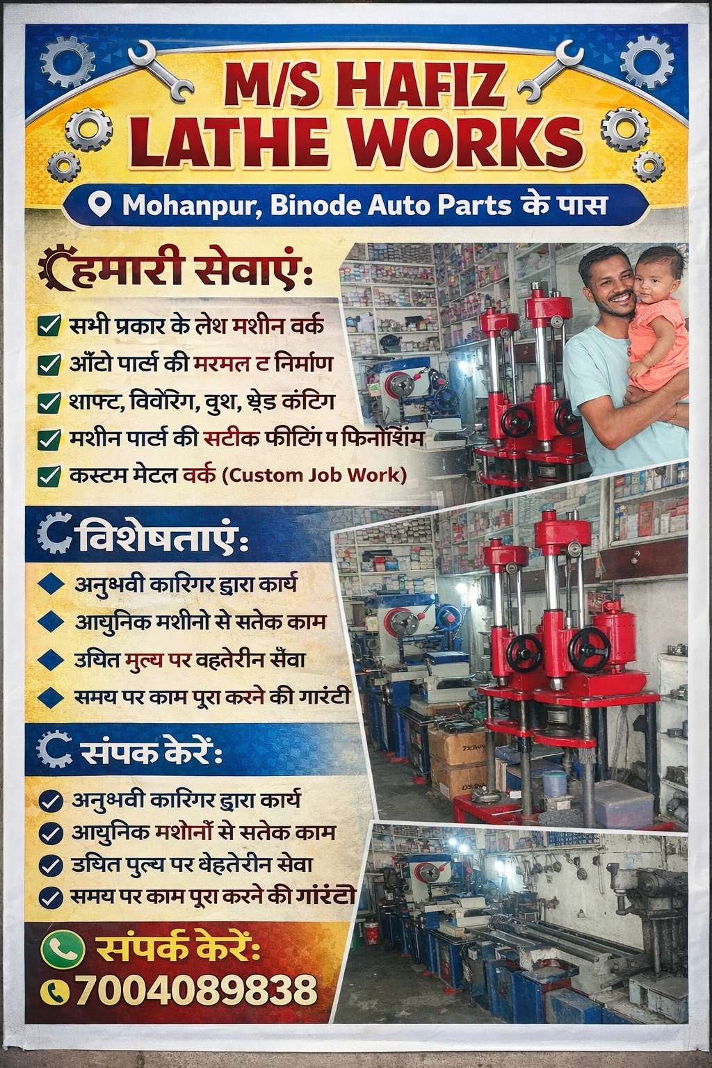🔧 M/S Hafiz Lathe Works 🔧 📍 Location: Mohanpur, Binode Auto Parts के पास ⚙️ हमारी सेवाएं (Our Services): ✔️ सभी प्रकार के लेथ मशीन वर्क ✔️ ऑटो पार्