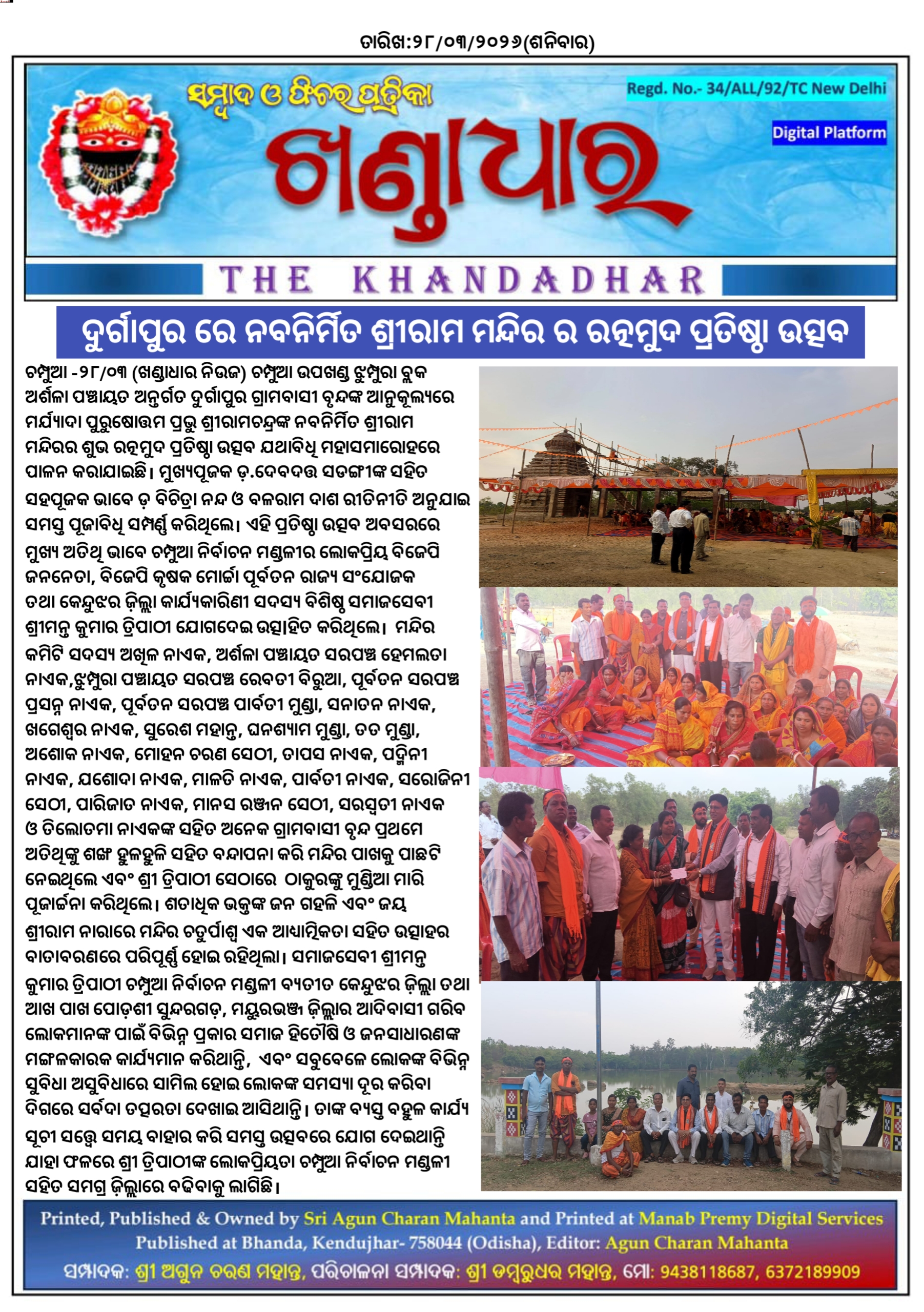 ଚମ୍ପୁଆ -୨୮/୦୩(ଖଣ୍ଡାଧାର ନିଉଜ) ଚମ୍ପୁଆ ଉପଖଣ୍ଡ ଝୁମ୍ପୁରା ବ୍ଲକ ଅର୍ଶଳା ପଞ୍ଚାୟତ ଅନ୍ତର୍ଗତ ଦୁର୍ଗାପୁର ଗ୍ରାମବାସୀ ବୃନ୍ଦଙ୍କ ଆନୁକୂଲ୍ୟରେ ମର୍ଯ୍ୟାଦା ପୁରୁଷୋତ୍ତମ ପ୍ରଭୁ ଶ୍ରୀରାମଚନ୍ଦ୍ରଙ୍କ ନବନିର୍ମିତ ଶ୍ରୀରାମ ମନ୍ଦିରର ଶୁଭ ରତ୍ନମୁଦ ପ୍ରତିଷ୍ଠା ଉତ୍ସବ ଯଥାବିଧି ମହାସମାରୋହରେ ପାଳନ କରାଯାଇଛି l ମୁଖ୍ୟପୂଜକ ଡ଼.ଦେବଦତ୍ତ ସଡଙ୍ଗୀଙ୍କ ସହିତ ସହପୂଜକ ଭାବେ ଡ଼ ବିଚିତ୍ରା ନନ୍ଦ ଓ ବଳରାମ ଦାଶ ରୀତିନୀତି ଅନୁଯାଇ ସମସ୍ତ ପୂଜାବିଧି ସମ୍ପର୍ଣ୍ଣ କରିଥିଲେ l