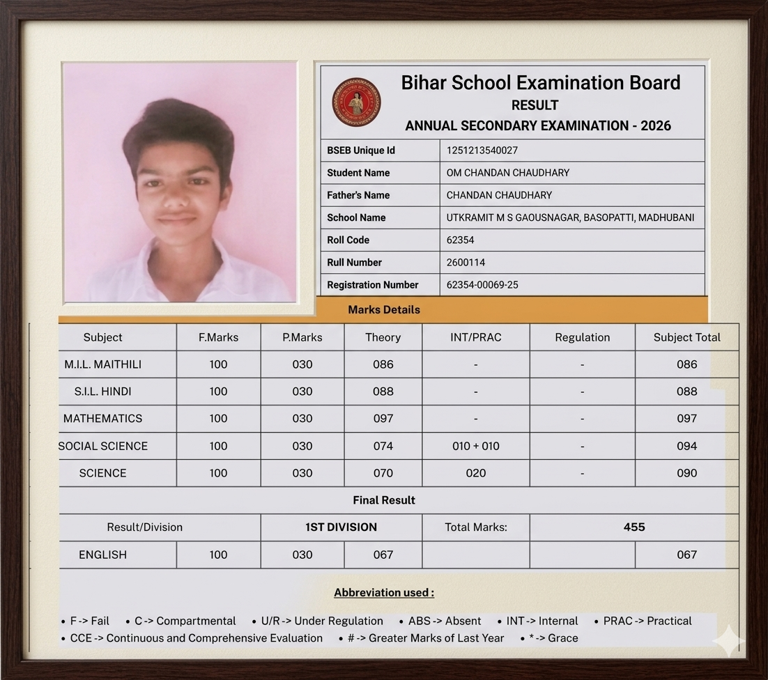 मधुबनी जिले के बासोपट्टी प्रखंड अंतर्गत गौसनगर (सीरियापुर) के होनहार विद्यार्थी ओम चंदन चौधरी ने बिहार स्कूल परीक्षा बोर्ड की 10वीं परीक्षा 2026 में शानदार प्रदर्शन करते हुए 455 अंक हासिल कर न सिर्फ अपने स्कूल बल्कि पूरे जिले का नाम रोशन किया है।