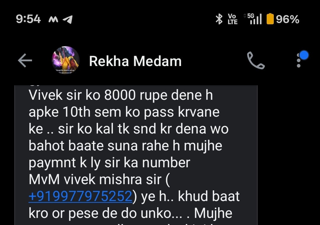 माधव विधि महाविद्यालय मैं छात्रों से ₹8000 लेकर पास करने का मामला सामने आया है जिसमें पर सब्जेक्ट के ₹2000 लिए जाते है अगर छात्र पैसे नहीं देता है तो उसे फेल करने की धमकी, या केस में फसाने की धमकी दी जाती है छात्र के मोबाइल स्क्रीनशॉट में महाविद्यालय की महिला प्रोफेसर साफ़-साफ़ ₹8000 मांगती हुई दिखाई दे रही है