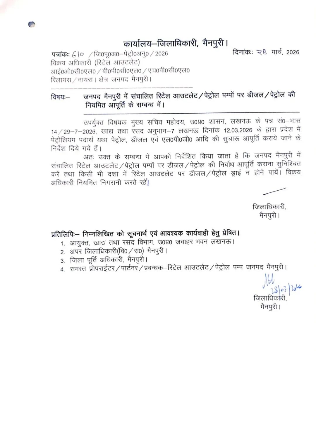 मैनपुरी जिला अधिकारी की तरफ से पेट्रोल डीजल से संबंधित दिशा निर्देश जारी