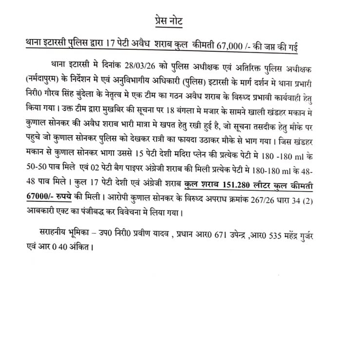 ЁЯЪи рдмреЬреА рдХрд╛рд░реНрд░рд╡рд╛рдИ: рдЗрдЯрд╛рд░рд╕реА рдкреБрд▓рд┐рд╕ рдиреЗ рдкрдХреЬреА 67,000 рд░реБрдкрдпреЗ рдХреА рдЕрд╡реИрдз рд╢рд░рд╛рдм! ЁЯЪФ
