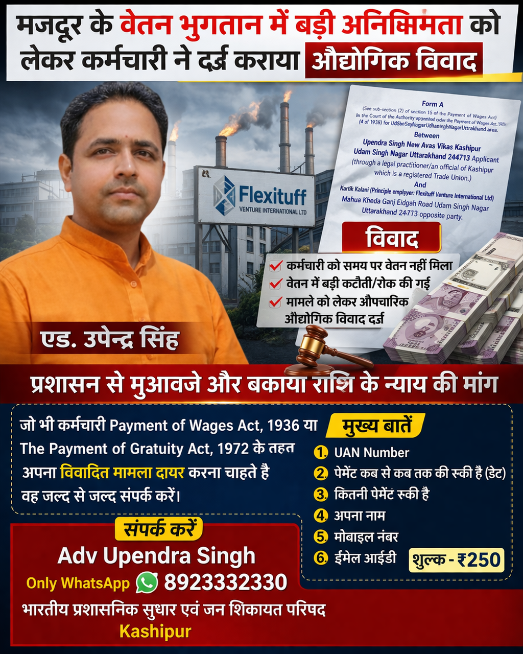 प्राप्त जानकारी के अनुसार, काशीपुर निवासी उपेंद्र सिंह ने आरोप लगाया है कि वह एक औद्योगिक प्रतिष्ठान में कार्यरत हैं, जहां उन्हें लंबे समय से उनके वेतन का भुगतान नहीं किया गया। आवेदन में बताया गया है कि 1 फरवरी 2025 से संबंधित वेतन अवधि के लिए करीब ₹2,50,000 की राशि बनती थी, जिसमें से ₹2,34,000 का भुगतान नहीं किया गया या अवैध रूप से काट लिया गया।