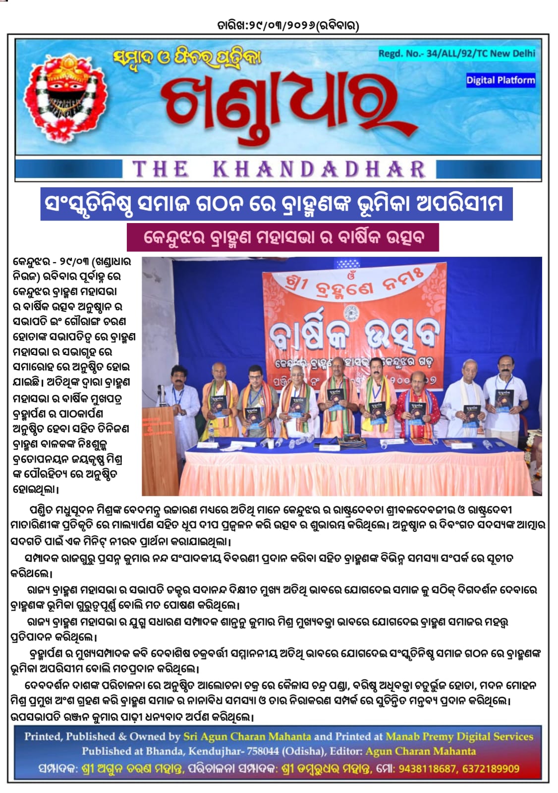 ସଂସ୍କୃତିନିଷ୍ଠ ସମାଜ ଗଠନ ରେ ବ୍ରାହ୍ମଣଙ୍କ ଭୂମିକା ଅପରିସୀମ। କେନ୍ଦୁଝର ବ୍ରାହ୍ମଣ ମହାସଭା ର ବାର୍ଷିକ ଉତ୍ସବ।