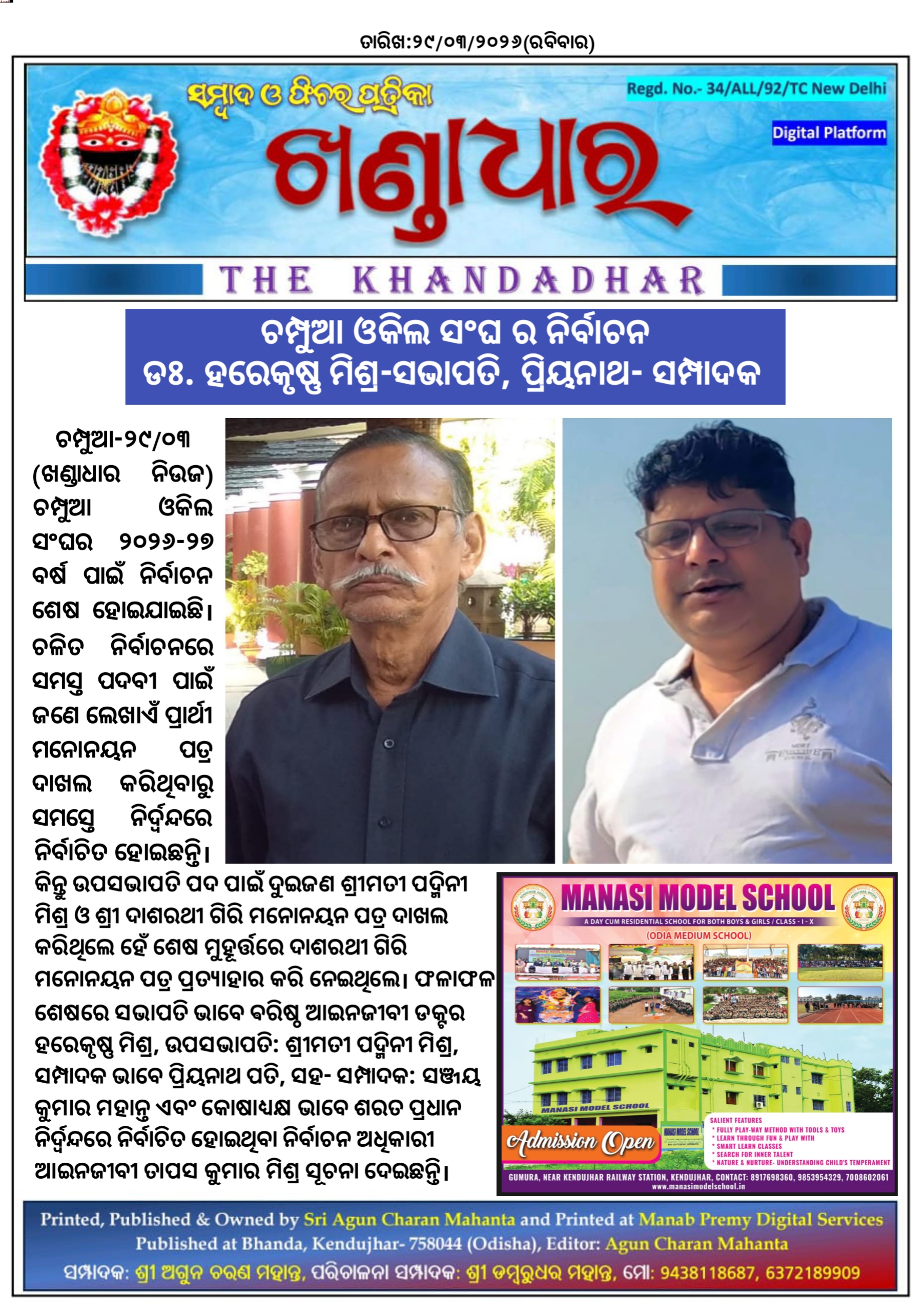 ଚମ୍ପୁଆ ଓକିଲ ସଂଘ ର ନିର୍ବାଚନ ଡଃ.ହରେକୃଷ୍ଣ ମିଶ୍ର-ସଭାପତି, ପ୍ରିୟନାଥ -ସମ୍ପାଦକ।