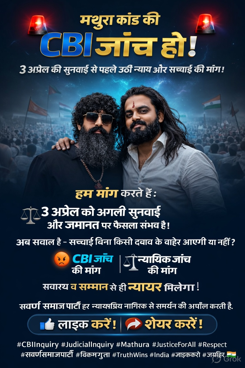 #CBIInquiry #JudicialInquiry #Mathura #JusticeForAll #सवर्णसमाजपार्टी #विक्रमगुप्ता #Respect #TruthWins #India #लाइककरो #शेयरकरो #जयहिंद 🚩