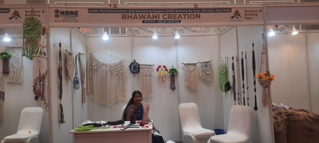 भवानी क्रिएशन का स्टॉल सुंदर मैक्रम कलाकृतियों से सजा हुआ है। CEO नीता कुमारी