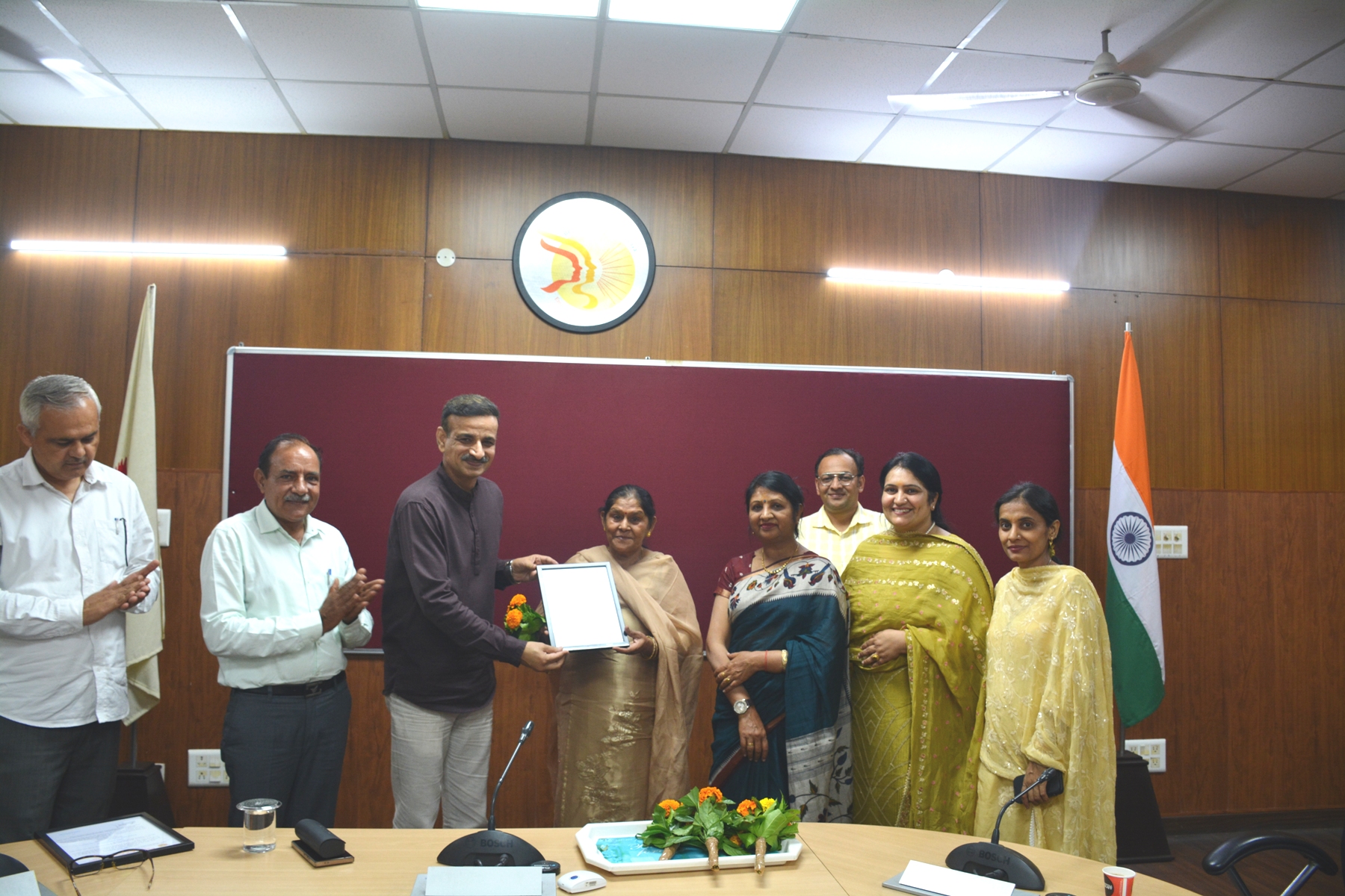 फोटो कैप्शन-02 - महिला विश्वविद्यालय से सेवानिवृत्त कर्मचारी को प्रशंसा पत्र भेंट करते हुए कुलसचिव प्रो शिवालिक यादव एवं अन्य।