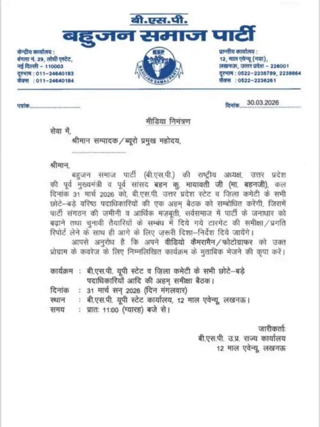लखनऊ, बहुजन समाज पार्टी की मुखिया पूर्व मुख्यमंत्री सुश्री मायावती ने एक बड़ी बैठक 12 मॉल एवेन्यू लखनऊ में बुलाई है। बैठक में मंडल, जिले और प्रदेश के पदाधिकारियों को बुलाया गया है।2027 में होने वाले विधान सभा आम चुनाव के मद्देनजर और बाबा साहेब डॉ भीम राव अम्बेडकर जयंती की पार्टी तैयारी की समीक्षा करते हुए नए निर्देश, तथा 11 बजे मीडिया के सभी प्रमुख समाचार पत्रों और चैनल के संवाददाताओं को संबोधित करेंगी।