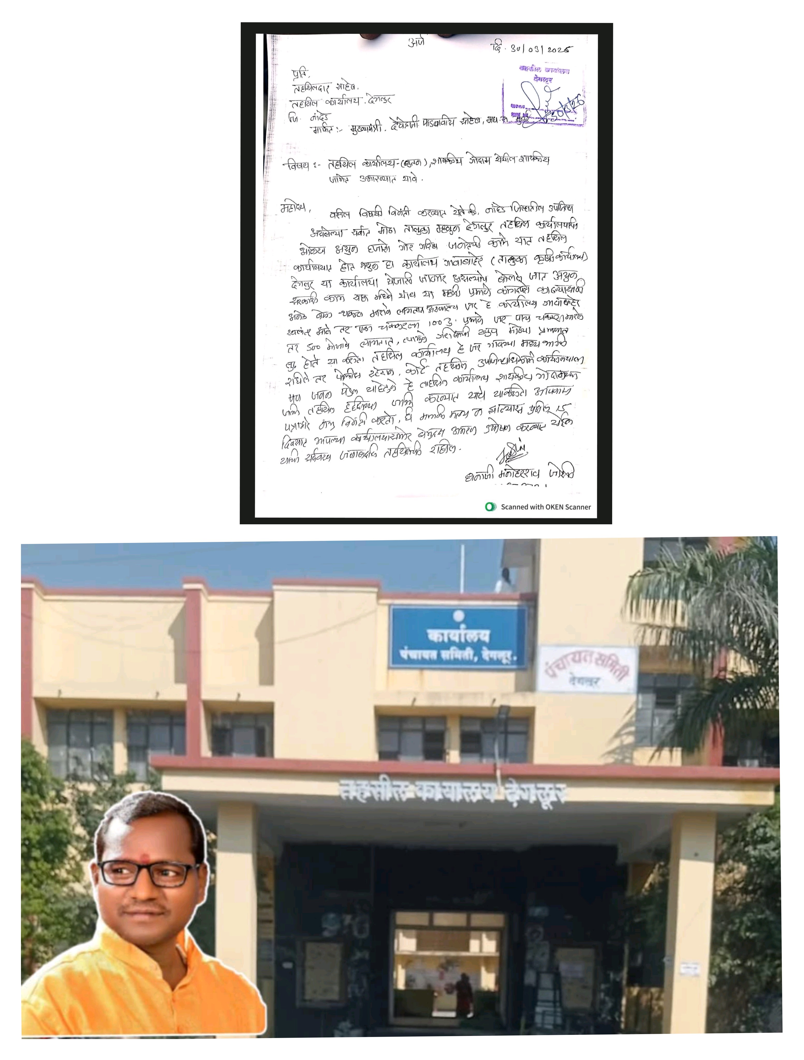 नांदेड जिल्ह्यातील सर्वांत मोठा असलेल्या उपजिल्हा देगलूर येथिल तहसील कार्यालय हे एका बड्या नेत्यांच्या स्वार्थासाठी जनतेची दिशाभूल करुन गावाबाहेरील असलेल्या तालुका कृषी कार्यालयाच्या आवारात घेऊन जाण्याच्या मार्गावर हलचाली सुरू झाल्या असून प्रत्यक्ष लोकप्रतिनिधी व कार्यालयातील उच्च अधिकारी यांनी जागेवर जाऊन पाहणी केल्याचे छायाचित्रे देगलूर वासियांनी पाहिले असुन हे जर तहसील कार्यालय गावाबाहेर गेले तर जनतेचे मोठी डोकेदुखी वाढणार व खिश्याला आर्थिक झळ सुध्दा बसणार,कारण सरकारी काम सहा महिने थांब,या म्हणी प्रमाणे जर एखाद्या व्यक्तीला एका कामासाठी जर तहसील पाच चकरा माराव्या लागल्या तर एक वेळा ॲटो 100 रु म्हणजे 5 वेळा 500 रुपये लागणार हि रक्कम सामान्य माणसाला परवडणारे नसुन तेवढे ,लांब (3 कि.मी)चालत जाऊ पण शकत नाही याकरिता देगलूर शहरातील सामाजिक कार्यकर्ते धनाजी जोशी यांनी तहसीलदार भरत सुर्यवंशी यांच्या मार्फत मुख्यमंत्री देवेंद्र फडणवीस यांच्या कडे लेखी निवेदनाद्वारे मागणी केली असून हि मागणी रास्त आहे.कारण तहसील कार्यालय हे जर शहराच्या मध्यभागी ठेवले तर ,नागरिकांना उपजिल्हाधिकारी कार्यालय, पोलिस स्टेशन, पोस्ट ऑफिस,न्यायालय,हि कार्यालय हाकेच्या अंतरावर राहतील व नागरिकांना हेलपाटे होणार नाही याकरिता देगलूरचे तहसील कार्यालय हे गावाबाहेर स्थलांतर न करता शहराच्या मध्यभागी उभारण्यात यावे, अन्यथा देगलूरचे सामाजिक कार्यकर्ते धनाजी जोशी यांच्या वतीने कार्यालयासमोर बेमुदत आमरण उपोषणाचा इशारा देण्यात आला आहे..