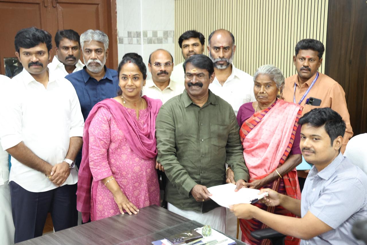 சட்டமன்றத் தேர்தல் 2026 இல் காரைக்குடி சட்டமன்றத் தொகுதி வேட்பாளராகப் போட்டியிடுகின்ற நாம் தமிழர் கட்சியின் தலைமை ஒருங்கிணைப்பாளர் செந்தமிழன் சீமான் அவர்கள் 30-03-2026 அன்று தேவகோட்டை தேர்தல் அலுவலகத்தில் வேட்புமனு தாக்கல் செய்த தருணம்.