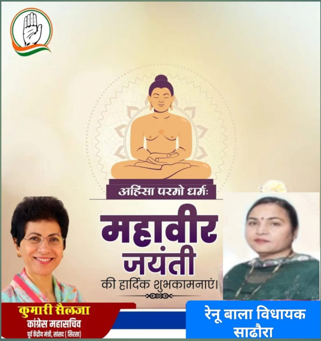 कपुरी :- हल्का सधौरा विधायक मैडम रेणु बाला जी नें महावीर जयंती पर शुभकामनायें दीं!