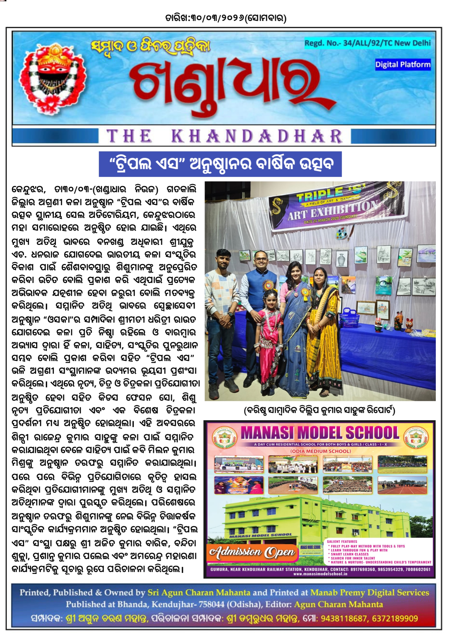 କେନ୍ଦୁଝର,ତା୩୦/୩- ଗତକାଲି ଜିଲ୍ଲାର ଅଗ୍ରଣୀ କଳା ଅନୁଷ୍ଠାନ “ଟ୍ରିପଲ ଏସ”ର ବାର୍ଷିକ ଉତ୍ସବ ସ୍ଥାନୀୟ ସେଲ ଅଡିଟୋରିୟମ, କେନ୍ଦୁଝରଠାରେ ମହା ସମାରୋହରେ ଅନୁଷ୍ଠିତ ହୋଇ ଯାଇଛି । ଏଥିରେ ମୁଖ୍ୟ ଅତିଥି ଭାବରେ ବନଖଣ୍ଡ ଅଧିକାରୀ ଶ୍ରୀଯୁକ୍ତ ଏଚ. ଧନରାଜ ଯୋଗଦେଇ ଭାରତୀୟ କଳା ସଂସ୍କୃତିର ବିକାଶ ପାଇଁ ଶୈଶବାବସ୍ଥାରୁ ଶିଶୁମାନଙ୍କୁ ଅନୁପ୍ରେରିତ କରିବା ଉଚିତ ବୋଲି ପ୍ରକାଶ କରି ଏଥିପାଇଁ ପ୍ରତ୍ଯେକ ଅଭିଭାବକ ଯତ୍ନଶୀଳ ହେବା ଜରୁରୀ ବୋଲି ମତବ୍ୟକ୍ତ କରିଥିଲେ । ସମ୍ମାନିତ ଅତିଥି ଭାବରେ ସ୍ଵେଚ୍ଛାସେବୀ ଅନୁଷ୍ଠାନ “ଓସକା”ର ସମ୍ପାଦିକା ଶ୍ରୀମତୀ ଧରିତ୍ରୀ ରାଉତ ଯୋଗଦେଇ କଳା ପ୍ରତି ନିଷ୍ଠା ରହିଲେ ଓ ବାରମ୍ବାର ଅଭ୍ୟାସ ଦ୍ଵାରା ହିଁ କଳା, ସାହିତ୍ଯ, ସଂସ୍କୃତିର ପୁନରୁଥାନ ସମ୍ଭବ ବୋଲି ପ୍ରକାଶ କରିବା ସହିତ “ଟ୍ରିପଲ ଏସ” ଭଳି ଅଗ୍ରଣୀ ସଂସ୍ଥାମାନଙ୍କ ଉଦ୍ୟମର ଭୂୟସୀ ପ୍ରଶଂସା କରିଥିଲେ । ଏଥିରେ ନୃତ୍ୟ, ଚିତ୍ର ଓ ଚିତ୍ରକଳା ପ୍ରତିଯୋଗୀତା ଅନୁଷ୍ଠିତ ହେବା ସହିତ କିଡସ ଫେସନ ସୋ, ଶିଶୁ ନୃତ୍ୟ ପ୍ରତିଯୋଗୀତା ଏବଂ ଏକ ବିଶେଷ ଚିତ୍ରକଳା ପ୍ରଦର୍ଶନୀ ମଧ୍ୟ ଅନୁଷ୍ଠିତ ହୋଇଥିଲା । ଏହି ଅବସରରେ ଶିଳ୍ପୀ ରାଜେନ୍ଦ୍ର କୁମାର ସାହୁଙ୍କୁ କଳା ପାଇଁ ସମ୍ମାନିତ କରାଯାଇଥିବା ବେଳେ ସାହିତ୍ୟ ପାଇଁ କବି ମିଲନ କୁମାର ମିଶ୍ରଙ୍କୁ ଅନୁଷ୍ଠାନ ତରଫରୁ ସମ୍ମାନିତ କରାଯାଇଥିଲା । ପରେ ପରେ ବିଭିନ୍ନ ପ୍ରତିଯୋଗିତାରେ କୃତିତ୍ଵ ହାସଲ କରିଥିବା ପ୍ରତିଯୋଗୀମାନଙ୍କୁ ମୁଖ୍ୟ ଅତିଥି ଓ ସମ୍ମାନିତ ଅତିଥିମାନଙ୍କ ଦ୍ଵାରା ପୁରସ୍କୃତ କରିଥିଲେ । ପରିଶେଷରେ ଅନୁଷ୍ଠାନ ତରଫରୁ ଶିଶୁମାନଙ୍କୁ ନେଇ ବିଭିନ୍ନ ଚିତ୍ତାକର୍ଷକ ସାଂସ୍କୃତିକ କାର୍ଯ୍ୟକ୍ରମମାନ ଅନୁଷ୍ଠିତ ହୋଇଥିଲା । “ଟ୍ରିପଲ ଏସ” ସଂସ୍ଥା ପକ୍ଷରୁ ଶ୍ରୀ ଅଜିତ କୁମାର ବାରିକ, ବନ୍ଦିତା ଶୁକ୍ଲା, ପ୍ରଶାନ୍ତ କୁମାର ପଲେଇ ଏବଂ ଅମରେନ୍ଦ୍ର ମହାରଣା କାର୍ଯ୍ୟକ୍ରମଟିକୁ ସୂଚାରୁ ରୂପେ ପରିଚାଳନା କରିଥିଲେ ।