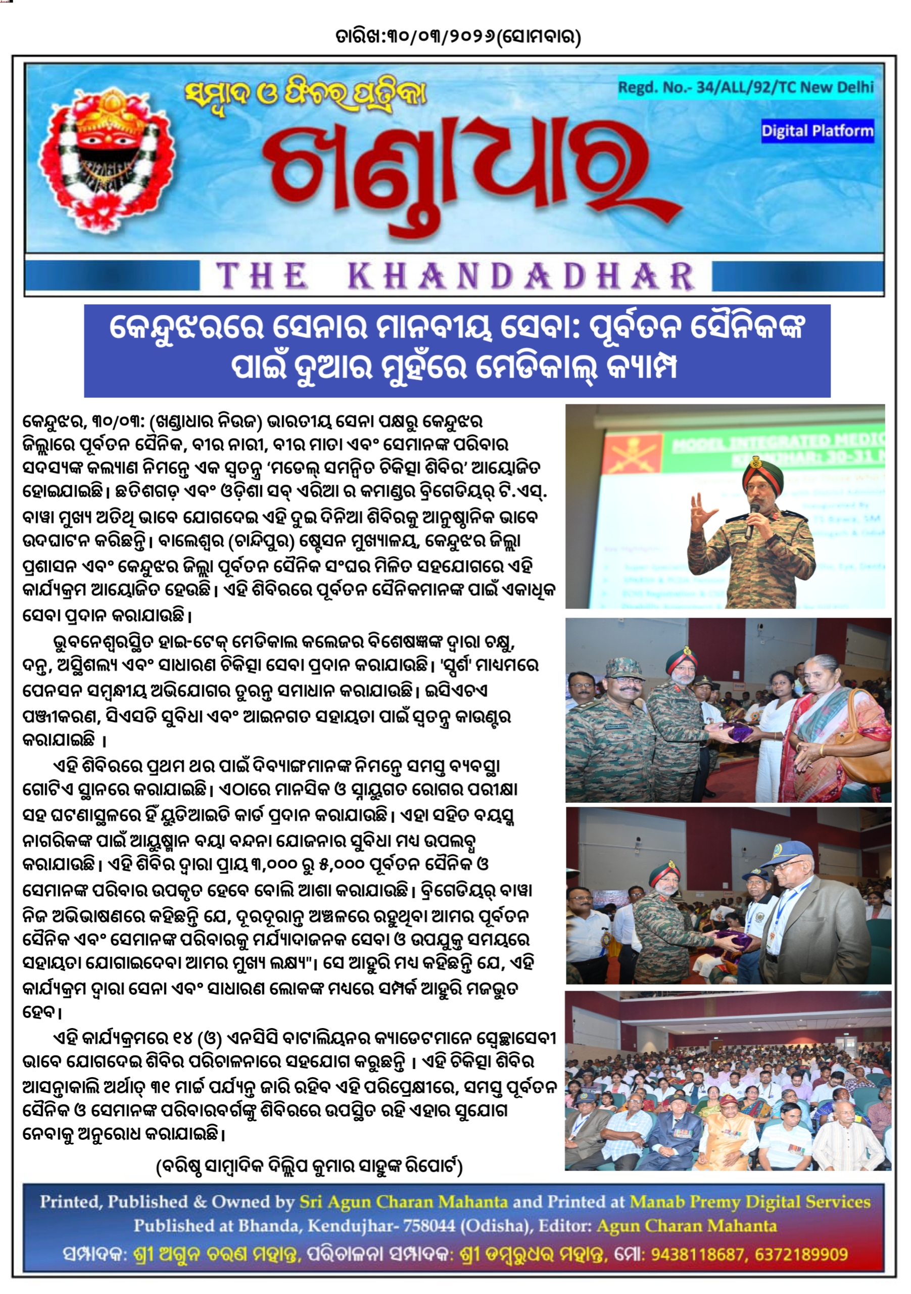 ​କେନ୍ଦୁଝର, ୩୦.୦୩: ଭାରତୀୟ ସେନା ପକ୍ଷରୁ କେନ୍ଦୁଝର ଜିଲ୍ଲାରେ ପୂର୍ବତନ ସୈନିକ, ବୀର ନାରୀ, ବୀର ମାତା ଏବଂ ସେମାନଙ୍କ ପରିବାର ସଦସ୍ୟଙ୍କ କଲ୍ୟାଣ ନିମନ୍ତେ ଏକ ସ୍ୱତନ୍ତ୍ର ‘ମଡେଲ୍ ସମନ୍ୱିତ ଚିକିତ୍ସା ଶିବିର’ ଆୟୋଜିତ ହୋଇଯାଇଛି । ଛତିଶଗଡ଼ ଏବଂ ଓଡ଼ିଶା ସବ୍ ଏରିଆ ର କମାଣ୍ଡର ବ୍ରିଗେଡିୟର୍ ଟି.ଏସ୍. ବାୱା ମୁଖ୍ୟ ଅତିଥି ଭାବେ ଯୋଗଦେଇ ଏହି ଦୁଇ ଦିନିଆ ଶିବିରକୁ ଆନୁଷ୍ଠାନିକ ଭାବେ ଉଦଘାଟନ କରିଛନ୍ତି । ବାଲେଶ୍ୱର (ଚାନ୍ଦିପୁର) ଷ୍ଟେସନ ମୁଖ୍ୟାଳୟ, କେନ୍ଦୁଝର ଜିଲ୍ଲା ପ୍ରଶାସନ ଏବଂ କେନ୍ଦୁଝର ଜିଲ୍ଲା ପୂର୍ବତନ ସୈନିକ ସଂଘର ମିଳିତ ସହଯୋଗରେ ଏହି କାର୍ଯ୍ୟକ୍ରମ ଆୟୋଜିତ ହେଉଛି । ଏହି ଶିବିରରେ ପୂର୍ବତନ ସୈନିକମାନଙ୍କ ପାଇଁ ଏକାଧିକ ସେବା ପ୍ରଦାନ କରାଯାଉଛି।
