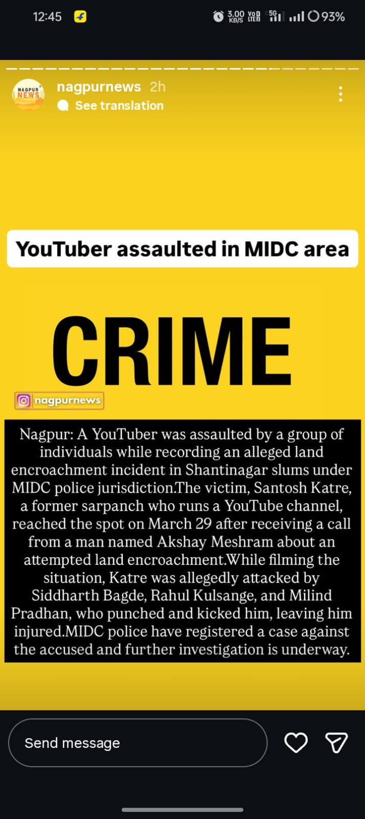 हिंगणा रोडवरील शांतीनगर इसासनी परिसरात जमीन वादातून गंभीर घटना समोर आली आहे. संतोष गोपीचंद कटरे (वय ४९ वर्ष ) शांतीनगर झोपडपट्टी परिसरात सुरू असलेल्या अवैध जमीन व्यवहाराच्या पार्श्वभूमीवर ते घटनास्थळी गेले असता काही जणांनी त्यांना अडवून मारहाण केली. मोबाईलमध्ये व्हिडिओ रेकॉर्डिंग करत असल्याच्या कारणावरून त्यांना लाथाबुक्क्यांनी मारहाण करत जीवे मारण्याची धमकी देण्यात आली.