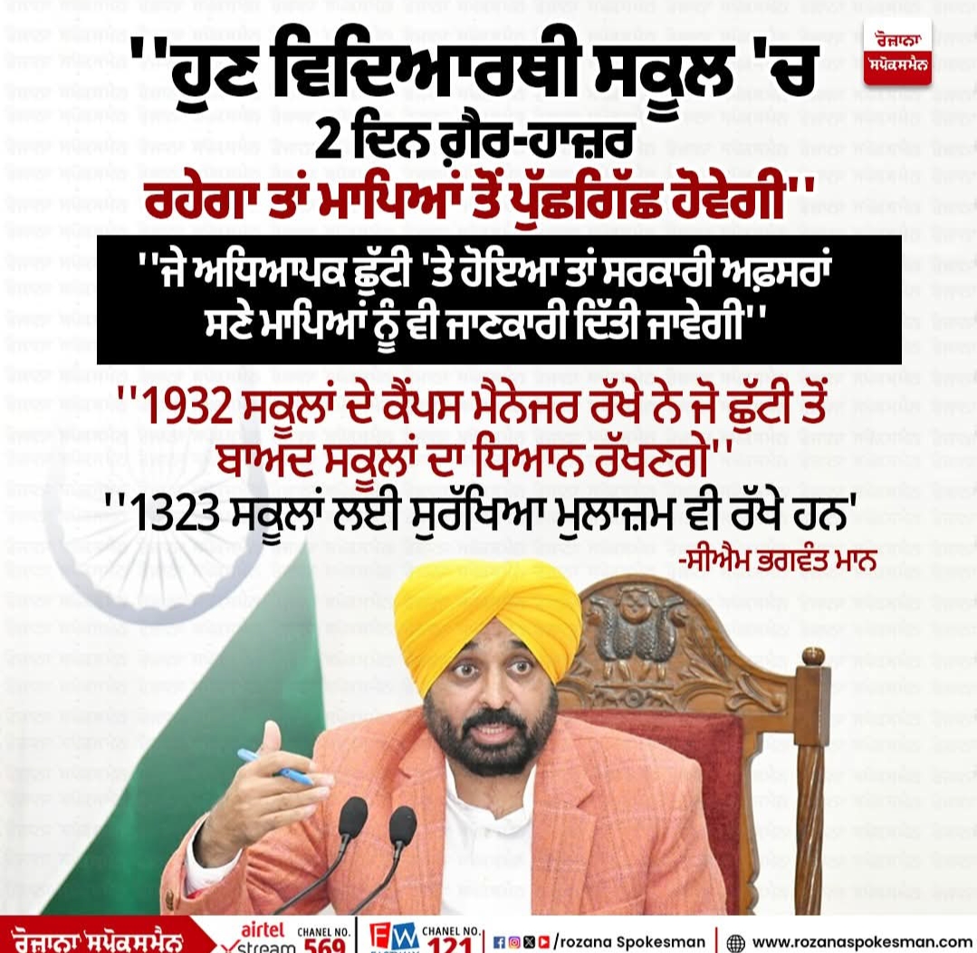 ''ਜੇ ਅਧਿਆਪਕ ਛੁੱਟੀ 'ਤੇ ਹੋਇਆ ਤਾਂ ਸਰਕਾਰੀ ਅਫ਼ਸਰਾਂ ਸਣੇ ਮਾਪਿਆਂ ਨੂੰ ਵੀ ਜਾਣਕਾਰੀ ਦਿੱਤੀ ਜਾਵੇਗੀ'' #Spokesmantv #punjab #punjabiNews #bhagwantmann
