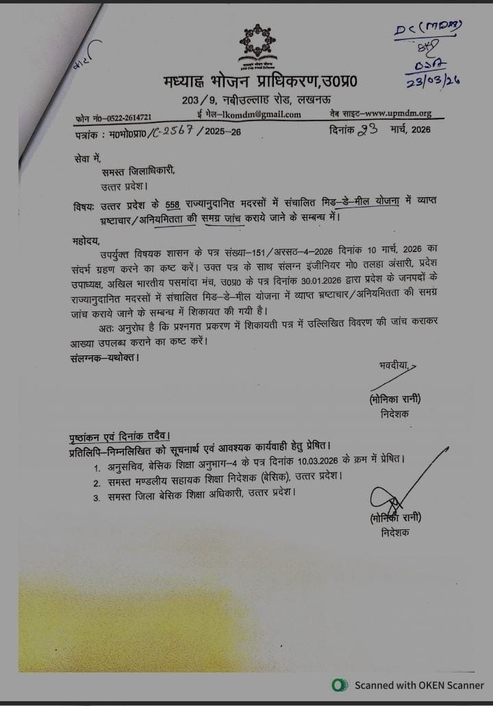 निदेशक, मध्यान्ह भोजन प्राधिकरण ने शिकायत पर जिलाधिकारी को जांच के लिए पत्र लिखा।