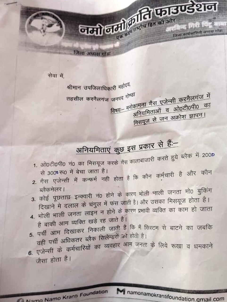 करनैलगंज में गैस एजेंसी पर अनियमितताओं के आरोप, एसडीएम को सौंपा गया ज्ञापन