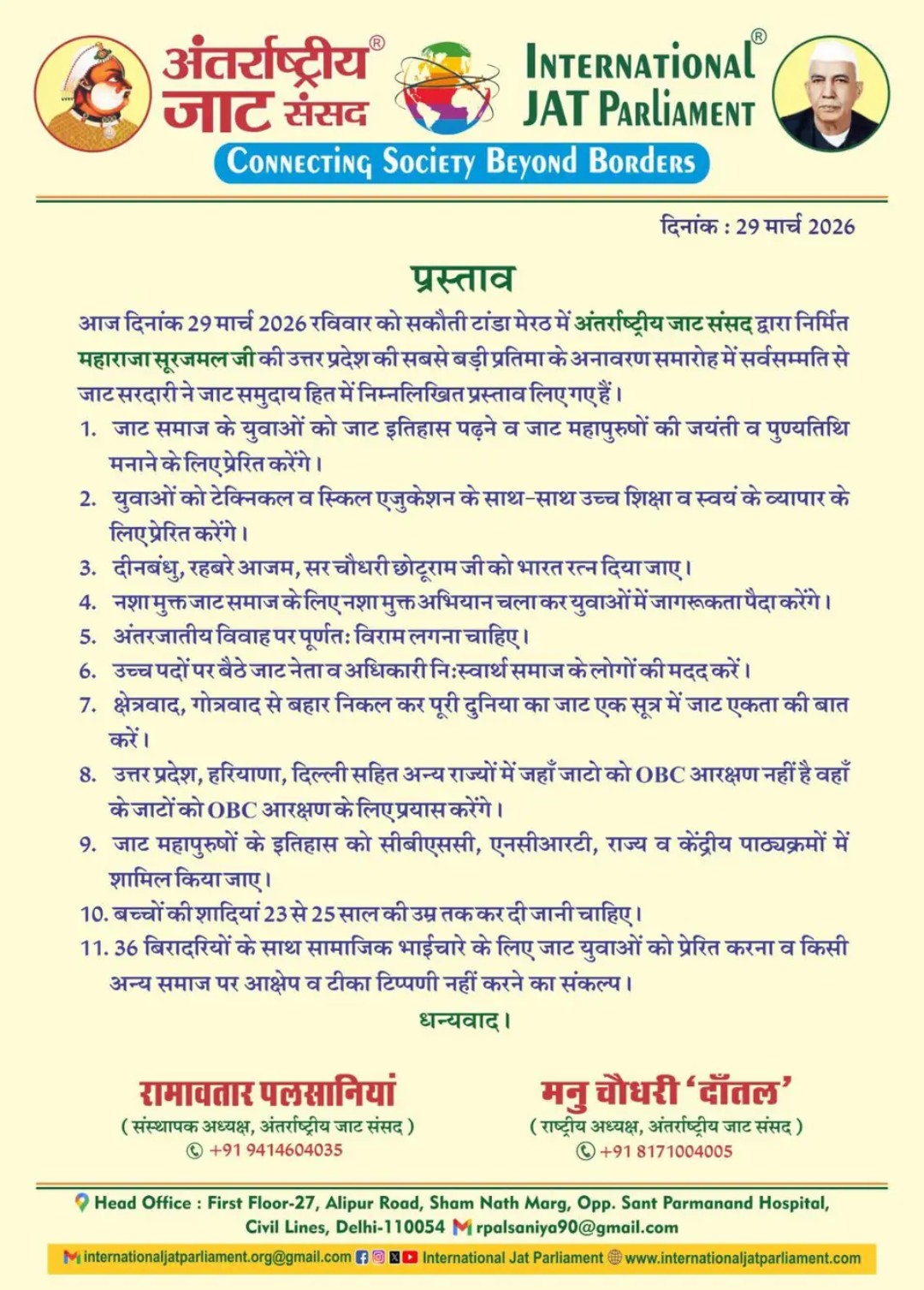 जाट समाज के हित अंतरराष्ट्रीय जाट सांसद द्वारा निम्न प्रस्ताव प्रेषित किए गए जिस पर पूरी समाज ने अपनी सहमति जताई