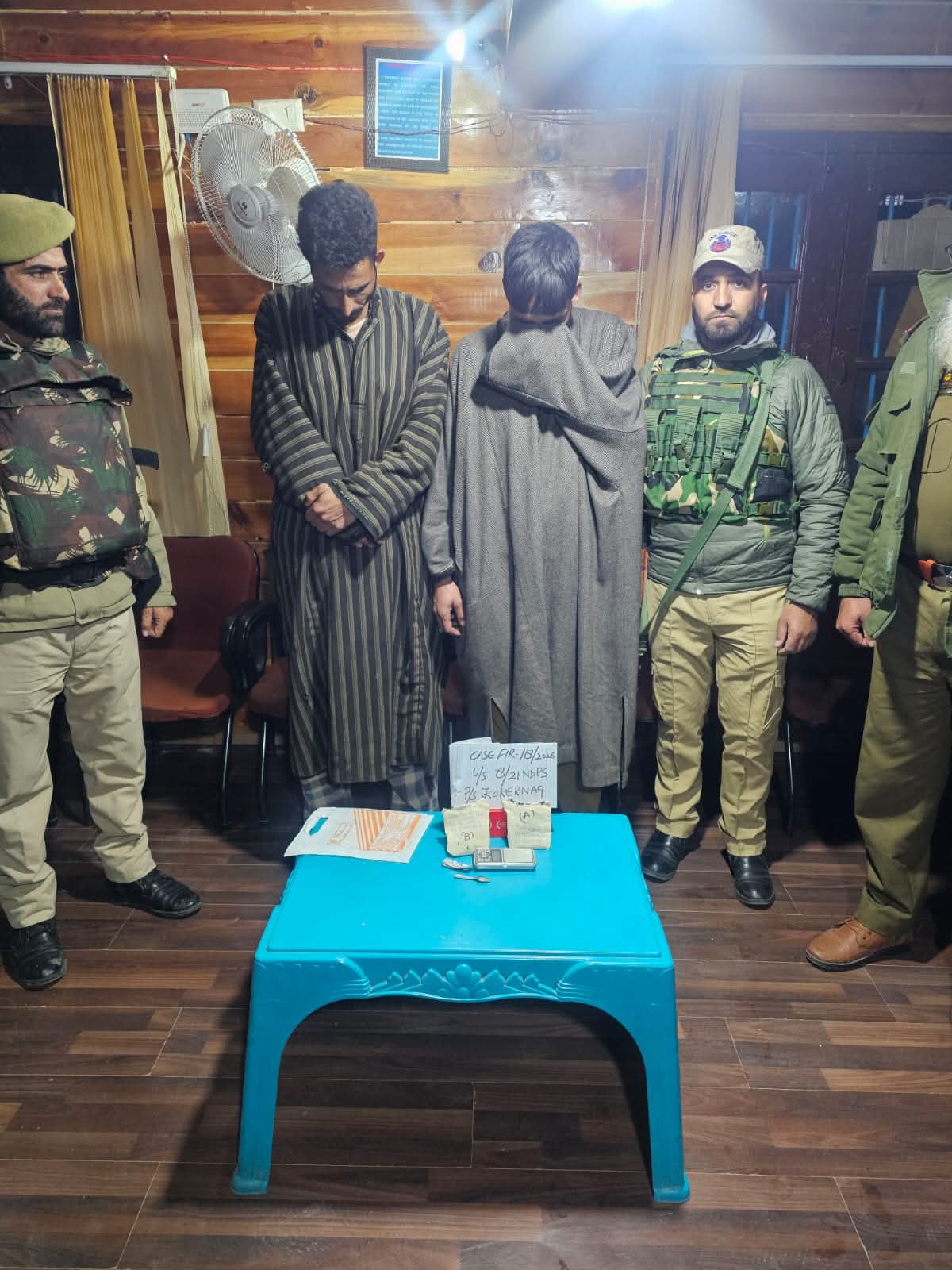 A police party from Police Station Kokernag, along with SOG Kokernag, established a naka at Hangulgund, Kokernag. During naka checking, two persons were noticed roaming in suspicious circumstances. Acting swiftly, the police party tactfully apprehended them for questioning.