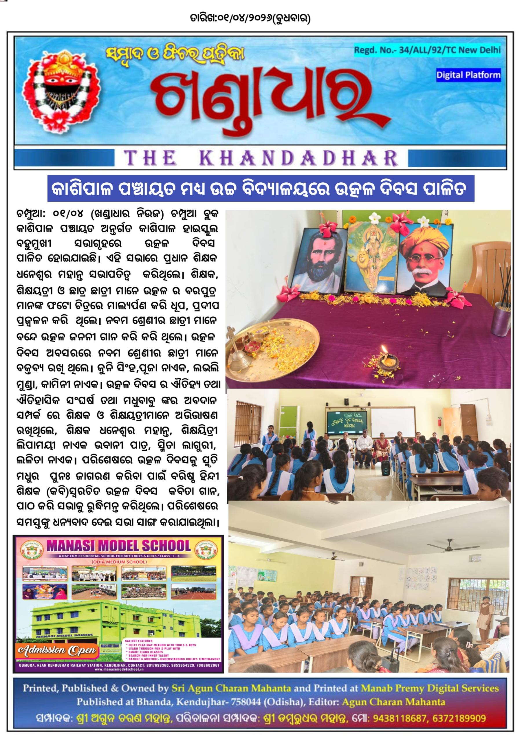 ଚମ୍ପୁଆ -୦୧/୦୪ (ଖଣ୍ଡାଧାର ନିଉଜ) ଚମ୍ପୁଆ ବ୍ଲକ କାଶିପାଳ ପଞ୍ଚାୟତ ଅନ୍ତର୍ଗତ କାଶିପାଳ ହାଇସ୍କୁଲ ବହୁମୁଖୀ ସଭାଗୃହରେ ଉତ୍କଳ ଦିବସ ପାଳିତ ହୋଇଯାଇଛି | ଏହି ସଭାରେ ପ୍ରଧାନ ଶିକ୍ଷକ ଧନେଶ୍ୱର ମହାନ୍ତ ସଭାପତିତ୍ୱ କରିଥିଲେ | ଶିକ୍ଷକ,ଶିକ୍ଷୟତ୍ରୀ ଓ଼ ଛାତ୍ର ଛାତ୍ରୀ ମାନେ ଉତ୍କଳ ର ବରପୁତ୍ର ମାନଙ୍କ ଫଟୋ ଚିତ୍ରରେ ମାଲ୍ୟର୍ପଣ କରି ଧୂପ,ପ୍ରଦୀପ ପ୍ରଜ୍ୱଳନ କରି ଥିଲେ | ନବମ ଶ୍ରେଣୀର ଛାତ୍ରୀ ମାନେ ବନ୍ଦେ ଉତ୍କଳ ଜନନୀ ଗାନ କରି କରି ଥିଲେ | ଉତ୍କଳ ଦିବସ ଅବସରରେ ନବମ ଶ୍ରେଣୀର ଛାତ୍ରୀ ମାନେ ବକ୍ତବ୍ୟ ରଖି ଥିଲେ | କୁନି ସିଂହ,ପୂଜା ନାଏକ, ଲଭଲି ମୁଣ୍ଡା,କାମିନୀ ନାଏକ l ଉତ୍କଳ ଦିବସ ର ଐତିହ୍ୟ ତଥା ଐତିହାସିକ ସଂଘର୍ଷ ତଥା ମଧୁବାବୁ ଙ୍କର ଅବଦାନ ସମ୍ପର୍କ ରେ ଶିକ୍ଷକ ଓ଼ ଶିକ୍ଷୟତ୍ରୀମାନେ ଅଭିଭାଷଣ ରଖିଥିଲେ, ଶିକ୍ଷକ ଧନେଶ୍ୱର ମହାନ୍ତ, ଶିକ୍ଷୟିତ୍ରୀ ଲିପାମୟୀ ନାଏକ