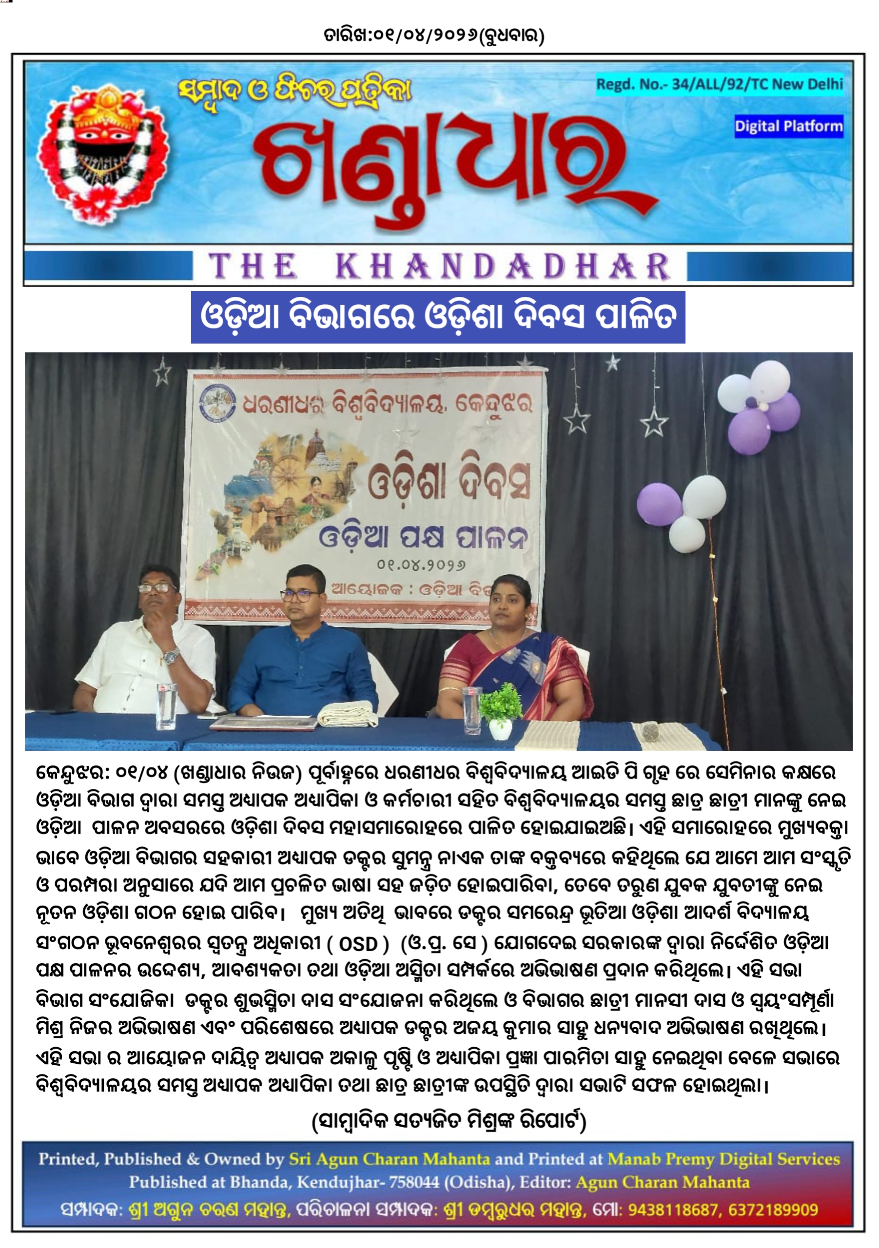 କେନ୍ଦୁଝର ତାରିଖ ୧/୪/୨୦୨୬ ପୂର୍ବାହ୍ନରେ ଧରଣୀଧର ବିଶ୍ଵବିଦ୍ୟାଳୟ ଆଇଡି ପି ଗୃହ ରେ ସେମିନାର କକ୍ଷରେ ଓଡ଼ିଆ ବିଭାଗ ଦ୍ୱାରା ସମସ୍ତ ଅଧ୍ୟାପକ ଅଧ୍ୟାପିକା ଓ କର୍ମଚାରୀ ସହିତ ବିଶ୍ୱବିଦ୍ୟାଳୟର ସମସ୍ତ ଛାତ୍ର ଛାତ୍ରୀ ମାନଙ୍କୁ ନେଇ ଓଡ଼ିଆ ପାଳନ ଅବସରରେ ଓଡ଼ିଶା ଦିବସ ମହାସମାରୋହରେ ପାଳିତ ହୋଇଯାଇଅଛି । ଏହି ସମାରୋହରେ ମୁଖ୍ୟବକ୍ତା ଭାବେ ଓଡ଼ିଆ ବିଭାଗର ସହକାରୀ ଅଧ୍ୟାପକ ଡକ୍ଟର ସୁମନ୍ତ୍ର ନାଏକ ତାଙ୍କ ବକ୍ତବ୍ୟରେ କହିଥିଲେ ଯେ ଆମେ ଆମ ସଂସ୍କୃତି ଓ ପରମ୍ପରା ଅନୁସାରେ ଯଦି ଆମ ପ୍ରଚଳିତ ଭାଷା ସହ ଜଡ଼ିତ ହୋଇପାରିବା , ତେବେ ତରୁଣ ଯୁବକ ଯୁବତୀଙ୍କୁ ନେଇ ନୂତନ ଓଡ଼ିଶା ଗଠନ ହୋଇ ପାରିବ । ମୁଖ୍ୟ ଅତିଥି ଭାବରେ ଡକ୍ଟର ସମରେନ୍ଦ୍ର ଭୂତିଆ ଓଡ଼ିଶା ଆଦର୍ଶ ବିଦ୍ୟାଳୟ ସଂଗଠନ ଭୁବନେଶ୍ବରର ସ୍ୱତନ୍ତ୍ର ଅଧିକାରୀ ( OSD ) (ଓ.ପ୍ର. ସେ ) ଯୋଗଦେଇ ସରକାରଙ୍କ ଦ୍ଵାରା ନିର୍ଦ୍ଦେଶିତ ଓଡ଼ିଆ ପକ୍ଷ ପାଳନର ଉଦ୍ଦେଶ୍ୟ, ଆବଶ୍ୟକତା ତଥା ଓଡ଼ିଆ ଅସ୍ମିତା ସମ୍ପର୍କରେ ଅଭିଭାଷଣ ପ୍ରଦାନ କରିଥିଲେ । ଏହି ସଭା ବିଭାଗ ସଂଯୋଜିକା ଡକ୍ଟର ଶୁଭସ୍ମିତା ଦାସ ସଂଯୋଜନା କରିଥିଲେ ଓ ବିଭାଗର ଛାତ୍ରୀ ମାନସୀ ଦାସ ଓ ସ୍ଵୟଂସମ୍ପୂର୍ଣା ମିଶ୍ର ନିଜର ଅଭିଭାଷଣ ଏବଂ ପରିଶେଷରେ ଅଧ୍ୟାପକ ଡକ୍ଟର ଅଜୟ କୁମାର ସାହୁ ଧନ୍ଯବାଦ ଅଭିଭାଷଣ ରଖିଥିଲେ । ଏହି ସଭା ର ଆୟୋଜନ ଦାୟିତ୍ୱ ଅଧ୍ୟାପକ ଅକାଳୁ ପୃଷ୍ଟି ଓ ଅଧ୍ୟାପିକା ପ୍ରଜ୍ଞା ପାରମିତା ସାହୁ ନେଇଥିବା ବେଳେ ସଭାରେ ବିଶ୍ୱବିଦ୍ୟାଳୟର ସମସ୍ତ ଅଧ୍ୟାପକ ଅଧ୍ୟାପିକା ତଥା ଛାତ୍ର ଛାତ୍ରୀଙ୍କ ଉପସ୍ଥିତି ଦ୍ୱାରା ସଭାଟି ସଫଳ ହୋଇଥିଲା ।