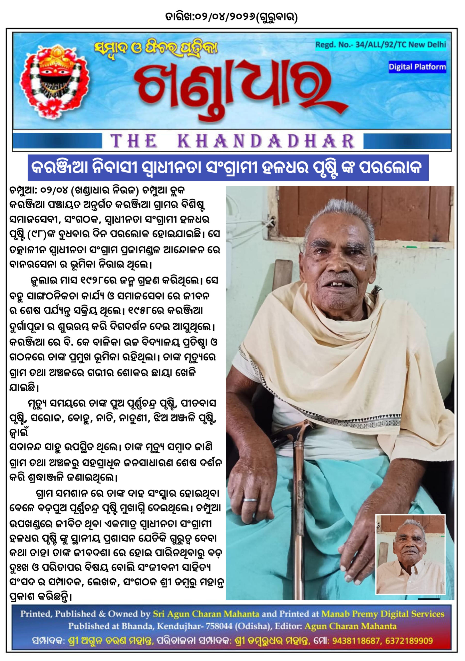 ଚମ୍ପୁଆ: ୦୨/୦୪ (ଖଣ୍ଡାଧାର ନିଉଜ) ଚମ୍ପୁଆ ବ୍ଲକ କରଞ୍ଜିଆ ପଞ୍ଚାୟତ ଅନ୍ତର୍ଗତ କରଞ୍ଜିଆ ଗ୍ରାମର ବିଶିଷ୍ଟ ସମାଜସେବୀ, ସଂଗଠକ, ସ୍ୱlଧୀନତା ସଂଗ୍ରାମୀ ହଳଧର ପୃଷ୍ଟି (୯୮)ଙ୍କ ବୁଧବାର ଦିନ ପରଲୋକ ହୋଇଯାଇଛି। ସେ ତତ୍କାଳୀନ ସ୍ୱlଧୀନତା ସଂଗ୍ରାମ ପ୍ରଜାମଣ୍ଡଳ ଆନ୍ଦୋଳନ ରେ ବାନରସେନା ର ଭୂମିକା ନିଭାଇ ଥିଲେ।