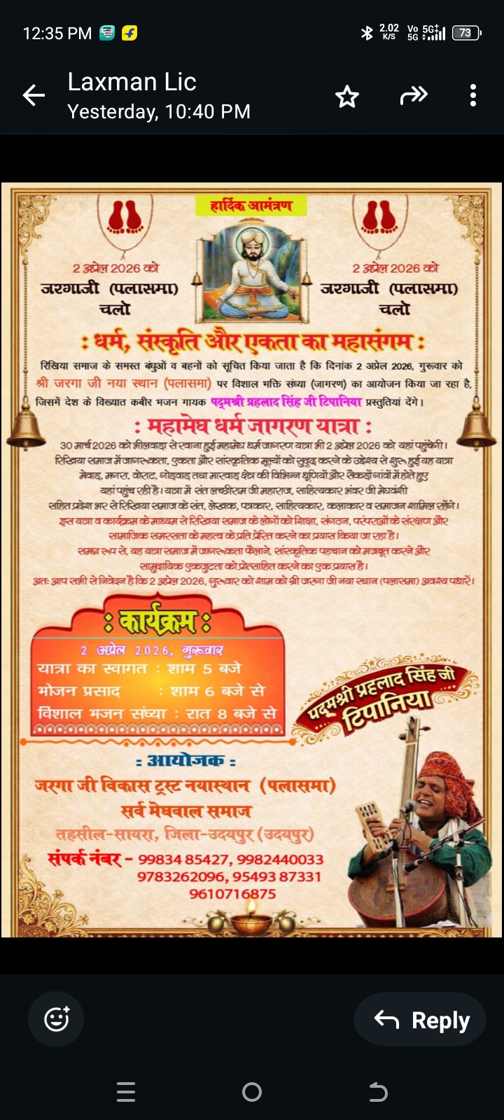 रात 8 बजे यहां विशाल भजन संध्या आयोजित की जाएगी, जिसमें *पद्मश्री प्रह्लाद सिंह जी टिपानिया* कबीर भजनों की प्रस्तुतियां देंगे।