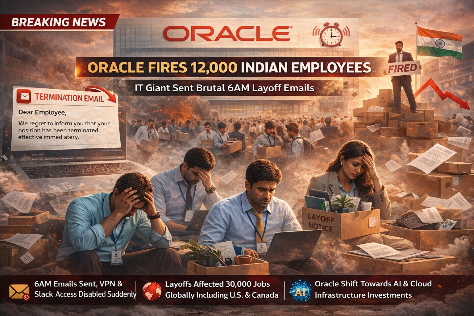 In a shocking development, Oracle Corporation has reportedly laid off around **12,000 employees in India** as part of a massive global restructuring exercise. The layoffs were communicated early in the morning, with many employees receiving termination emails at around **6 AM**, making the process sudden and unsettling.