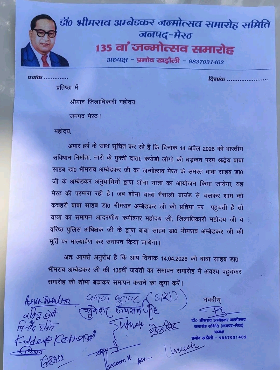 प्रमोद खड़ौली के नेतृत्व में अंबेडकर जयंती शोभायात्रा हेतु डीएम को दिया गया आमंत्रणमेरठ। डॉ. भीमराव अंबेडकर जी के जन्मोत्सव के उपलक्ष्य में आयोजित होने वाली भव्य शोभायात्रा को लेकर तैयारियां तेज हो गई हैं। इसी क्रम में डॉ. भीमराव अंबेडकर जी जन्मोत्सव समिति, जनपद मेरठ के अध्यक्ष श्री प्रमोद खड़ौली जी के नेतृत्व में एक प्रतिनिधिमंडल ने जिला अधिकारी महोदय से शिष्टाचार भेंट कर उन्हें शोभायात्रा में सम्मिलित होने हेतु औपचारिक आमंत्रण प्रदान किया।